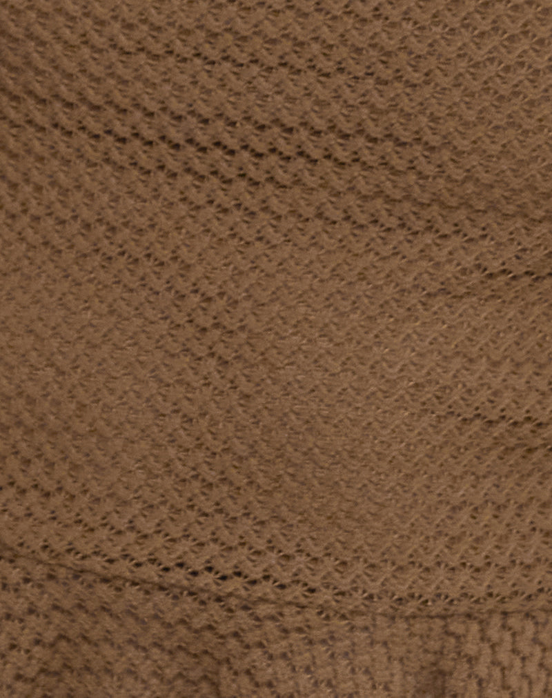 The Analu top in brown open knit features a peplum hemline, cami straps with bead detailing, and a mesh-lined front. The back is unlined. Pair with our low rise Roomy jorts.