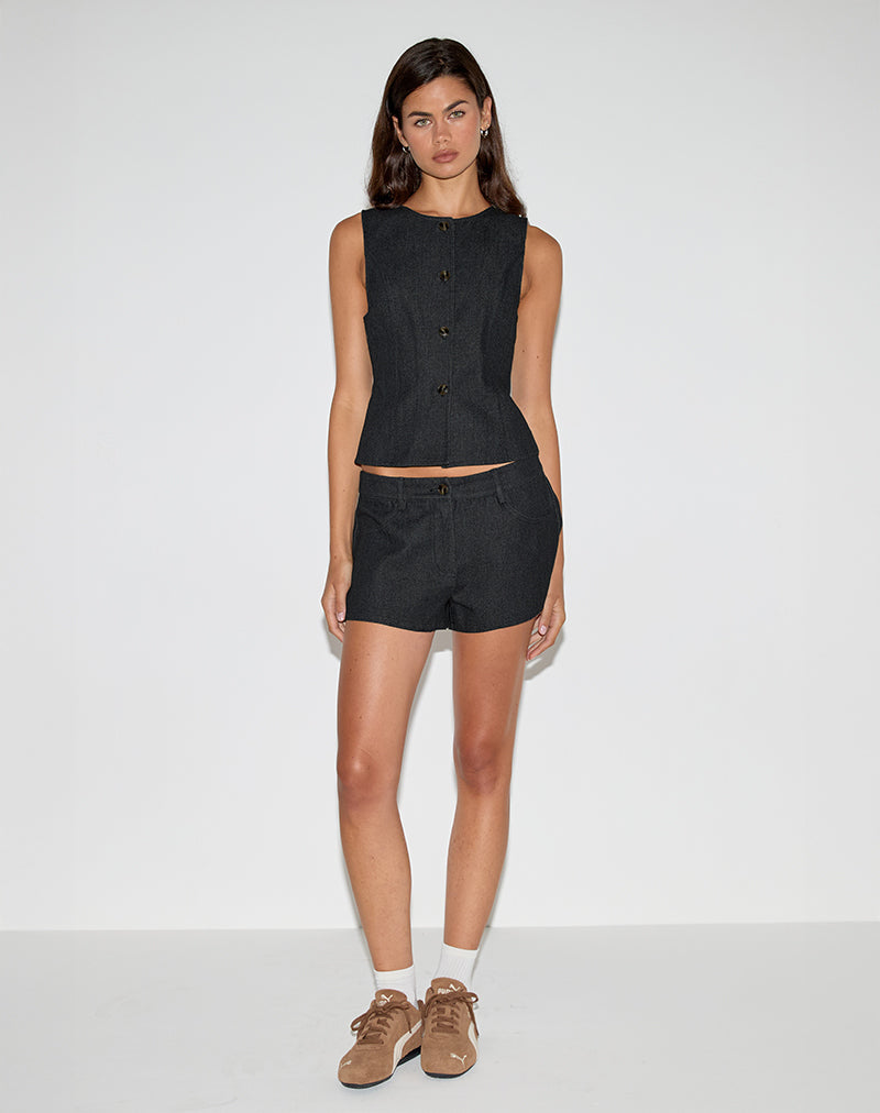 The Anila top in indigo stretch denim, offers a structured silhouette with a sleeveless design. Featuring a button-down front with bold metallic accents and a clean, tailored finish. Pair with our matching Elegi shorts.