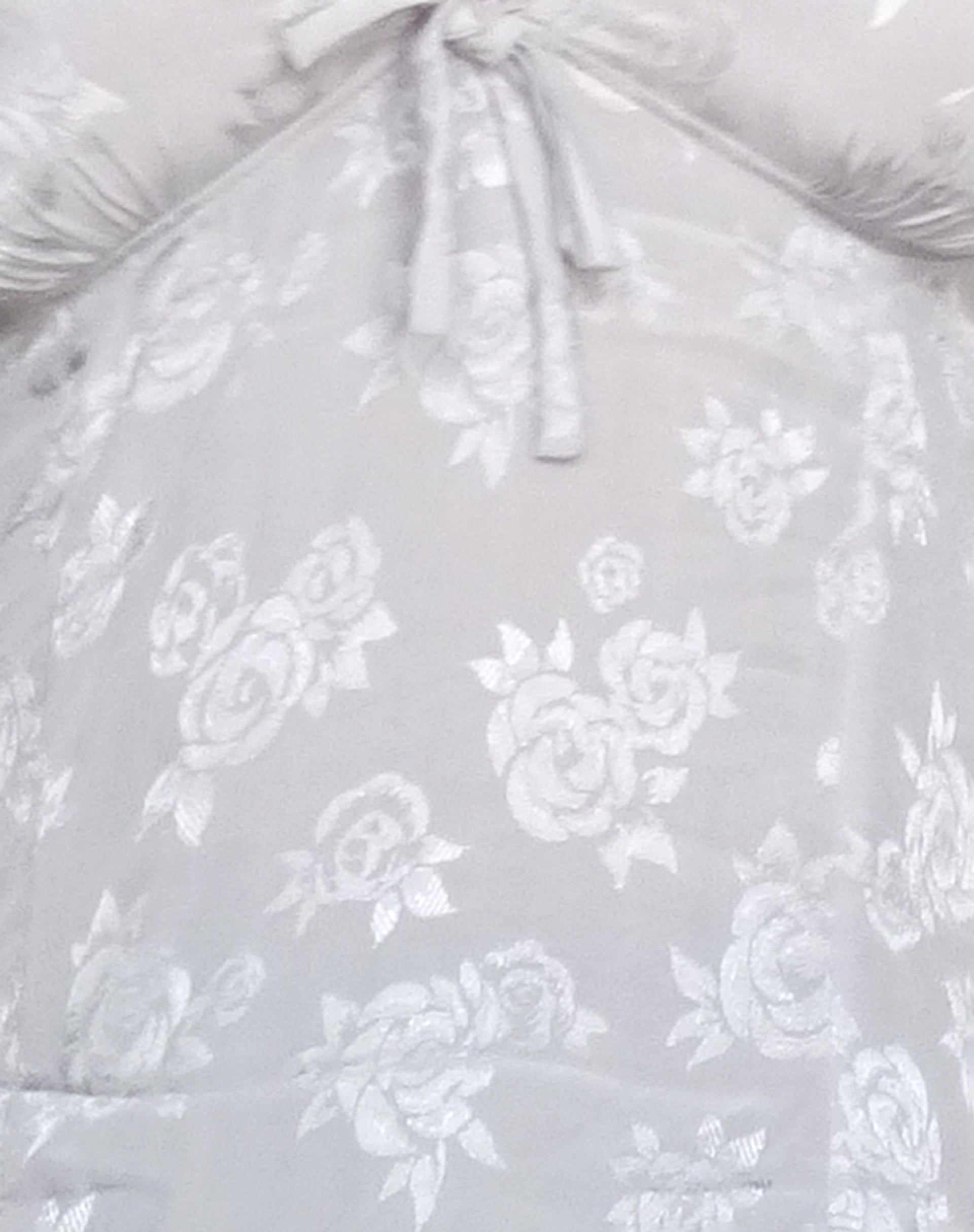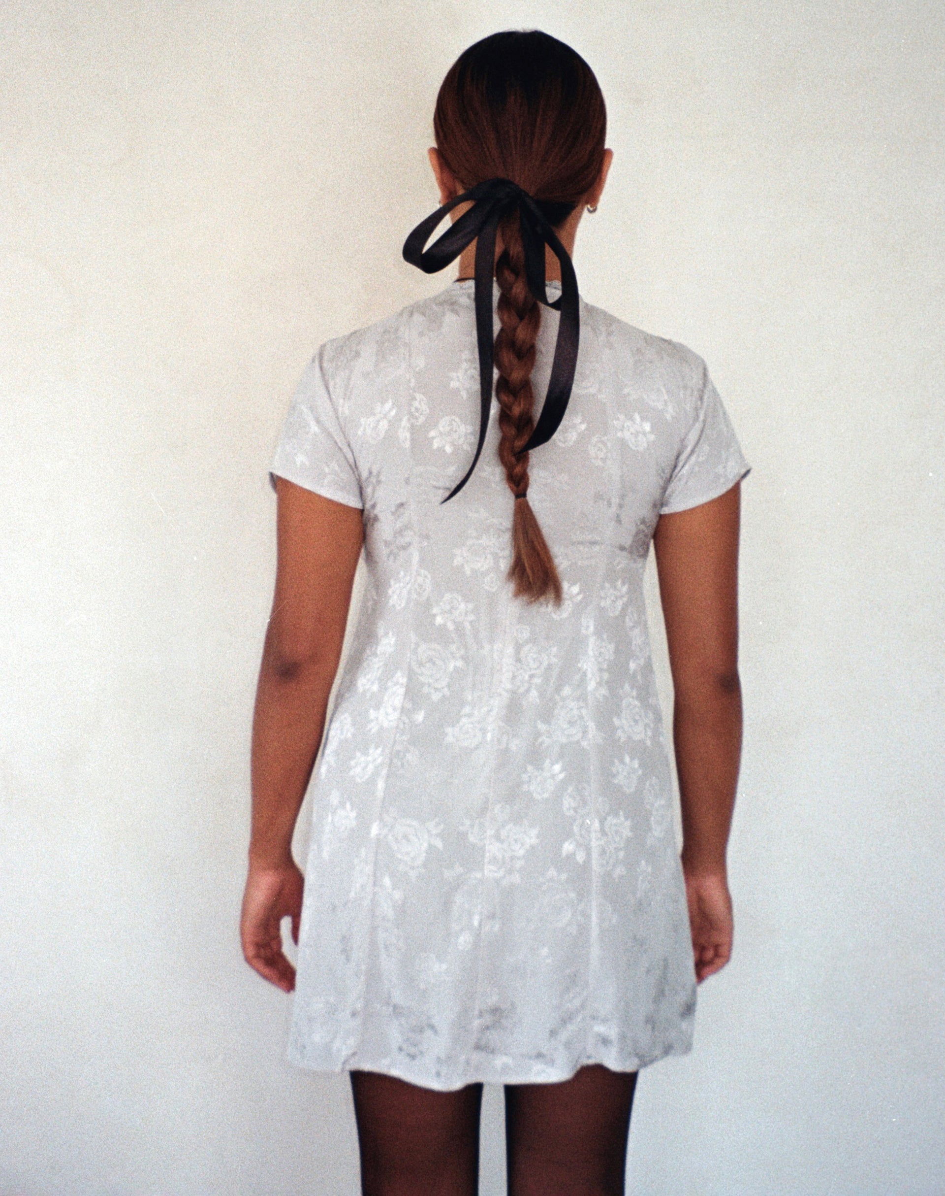 Mini length dress with short sleeve, under bust detailing, V neckline with lace trim and centre front bow, in a silver grey satin fabric with an all over rose jacquard.