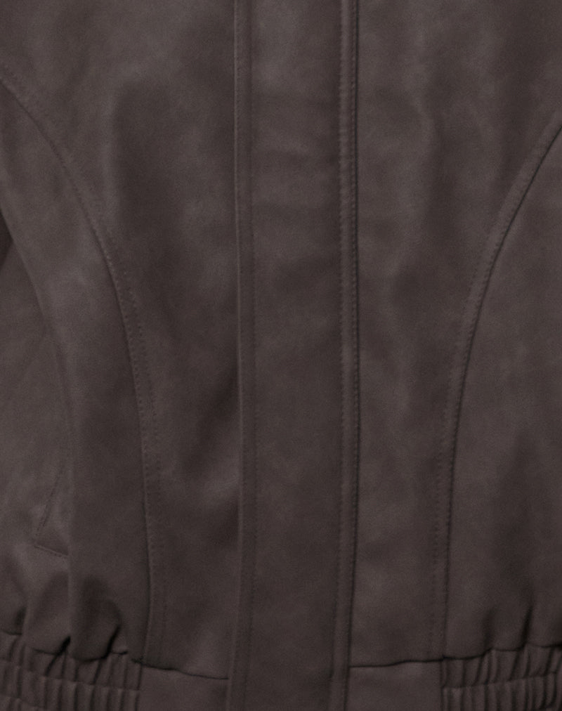The Aviara jacket in a PU dark brown fabric. Featuring a collared neck with zip and button fastening. Detailed with an elasticated waistband that sits just above the hips. Style with a pair of Parallel jeans and our Clio tee.