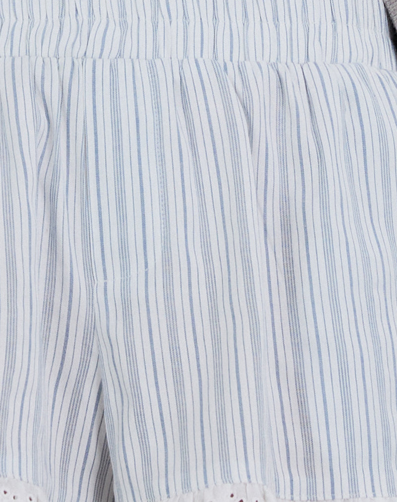 The Bonji shorts, crafted from a blue and white striped linen. Designed with a relaxed fit, elasticated waistband, and finished with broderie trimming along the hem. Style with the matching Kitami shirt.