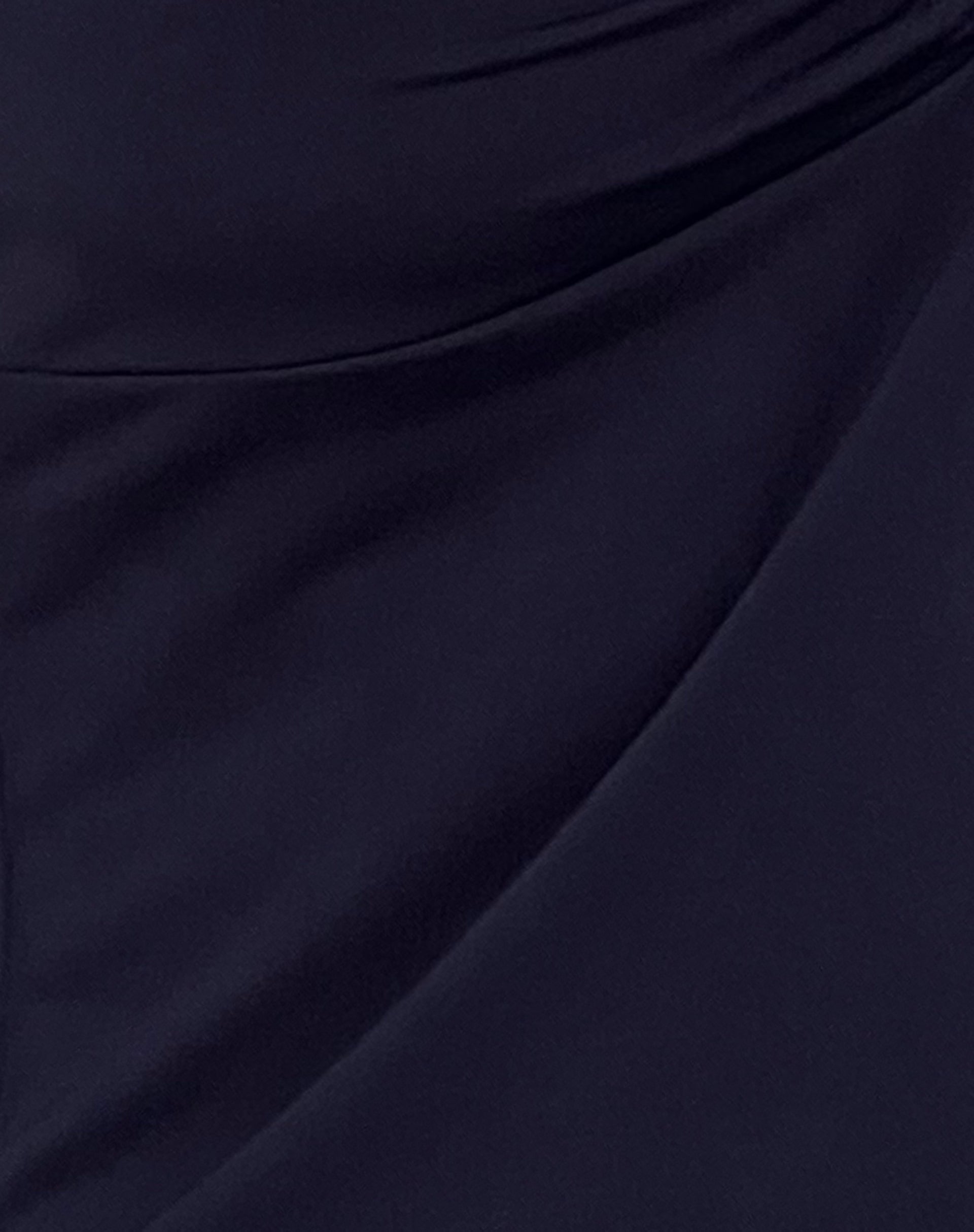 The Brea top features a bandeau neckline, a split front hem and an oval trim at the centre in a slinky navy material. Complete the look with our Roomy jeans in grey used bleach.