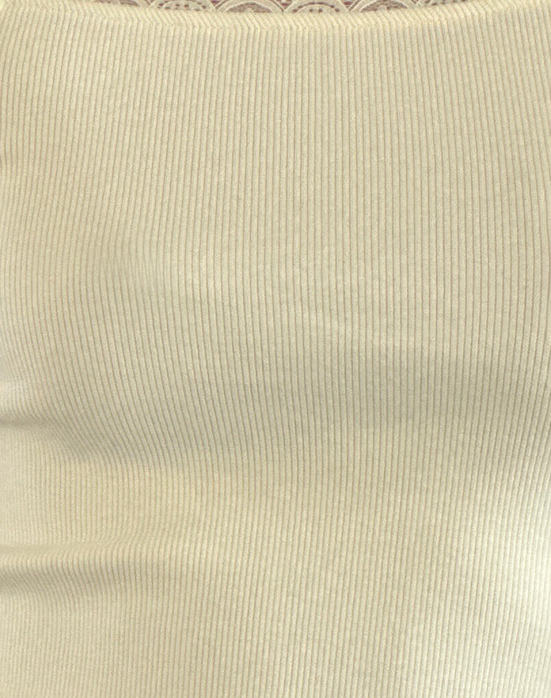 In buttercream, the Chacha top features an off shoulder bardot design in a rib fabric and lace detailing along the neckline. Best paired with the Asla capri trouser.