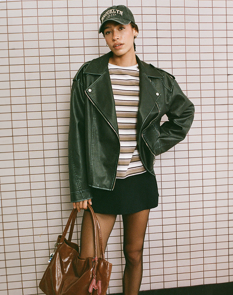 The Dafika top features a crew neckline with long sleeves and loose fit, regular length body. In a brown and white stripe jersey fabric. Style with the Nidya mini skirt and Zebbie biker jacket.