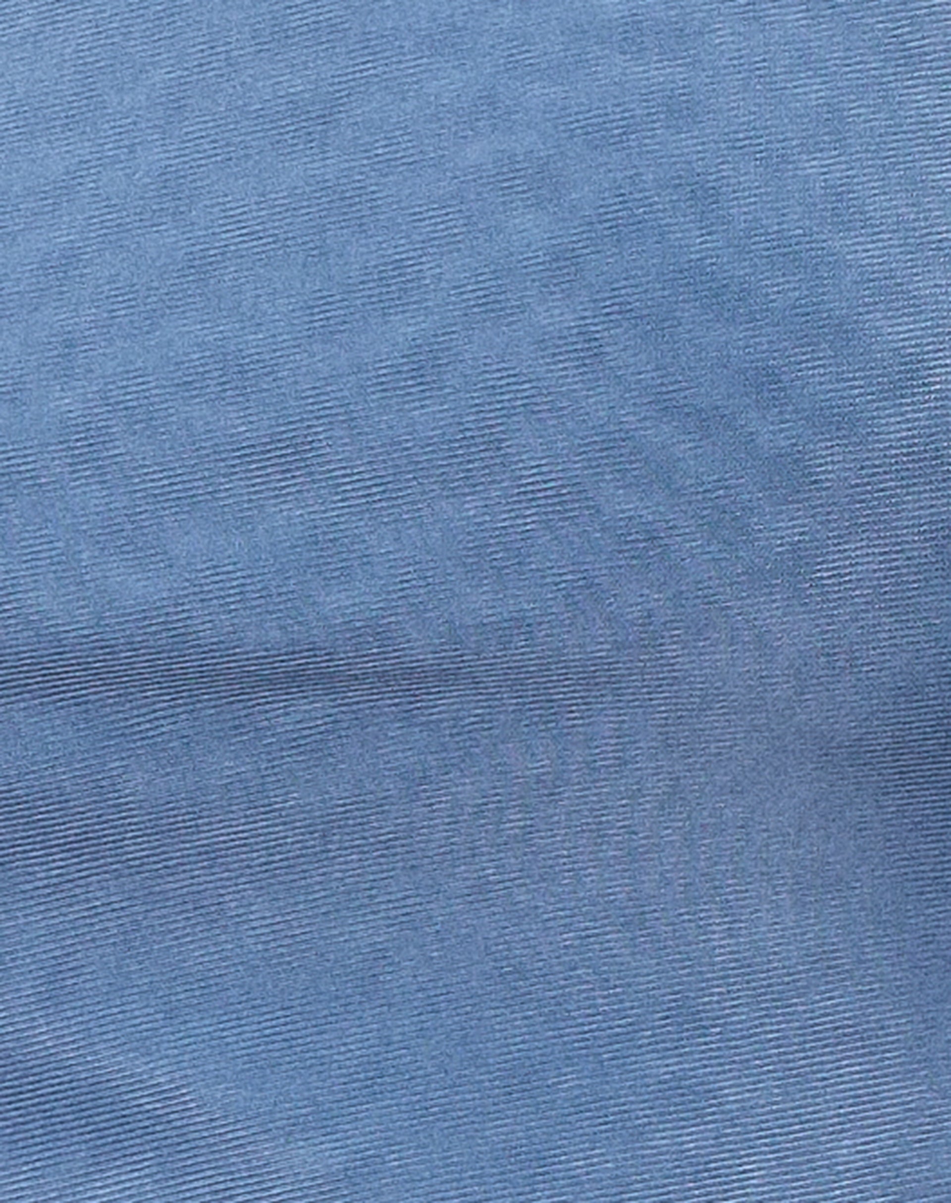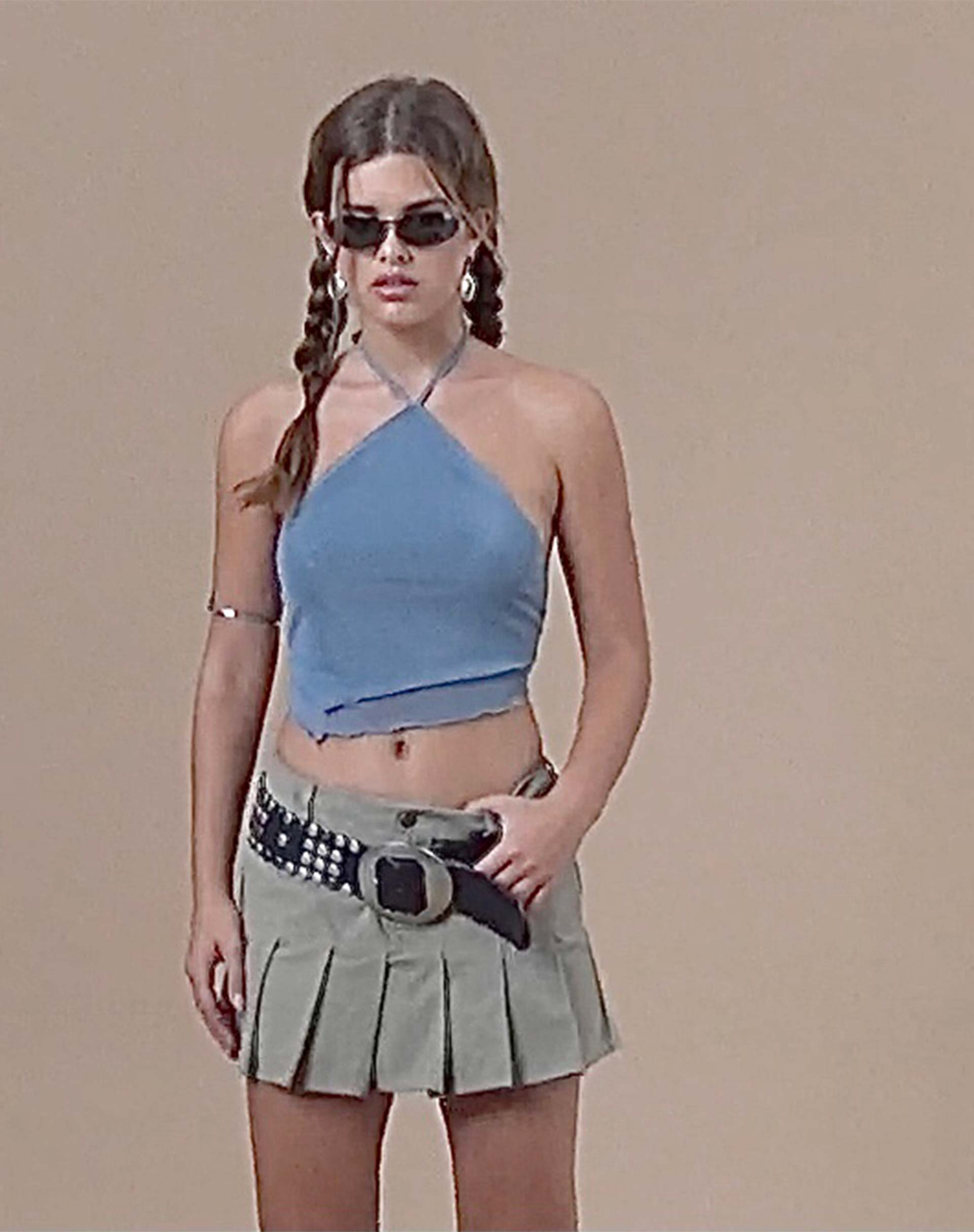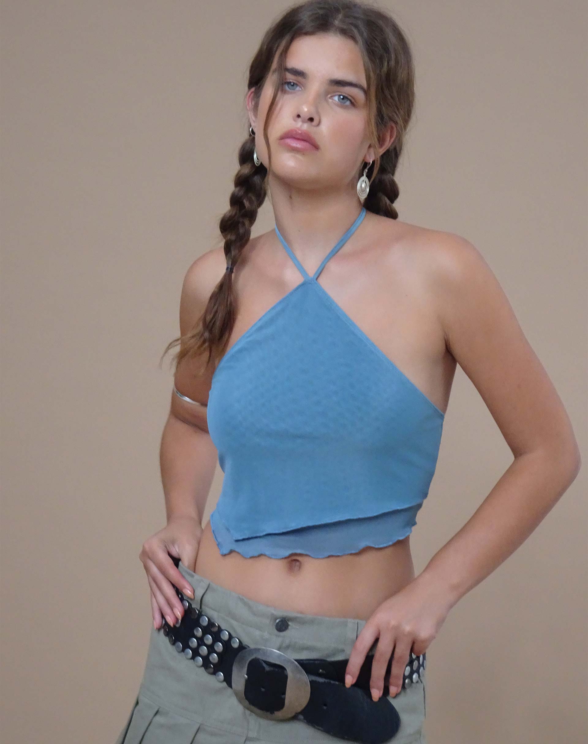 Our Daflien top features a cropped fit with thin, halterneck straps and an asymmetric, lettuce hemline in a blue mesh fabric. Complete the look with our Keripa skirt.