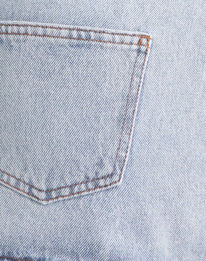 In a blue bleach denim fabric, this skirt features a mini length with a distressed hemline and a low-rise fit with a zip and button fastening. Style with our Emberly top.