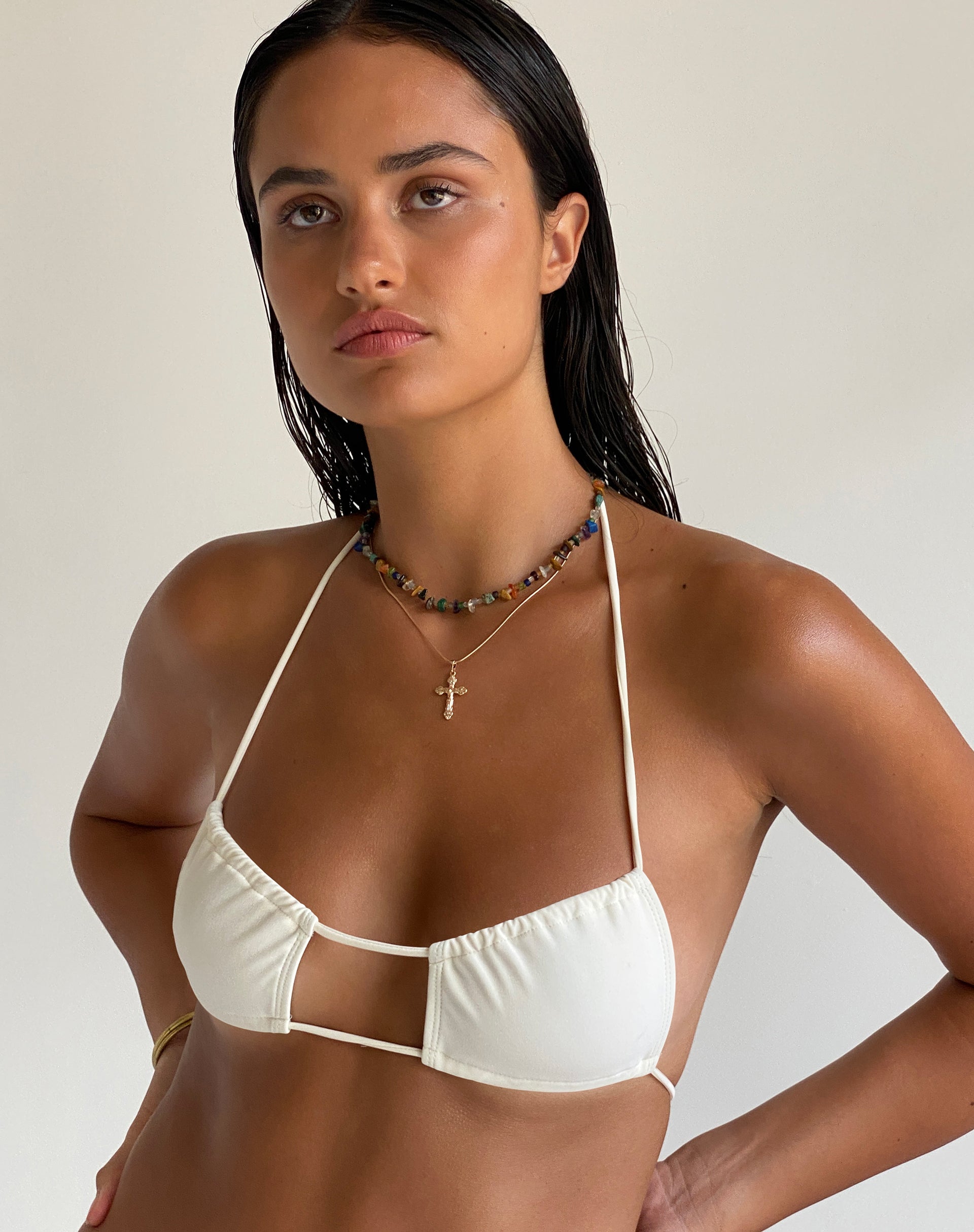Be ready for this swim season with our Dolan Bikini Top. Featuring adjustable halterneck straps and at the back, with a keyhole cutout at the front in a cream colour. Best paired with our Leyna bikini bottom.