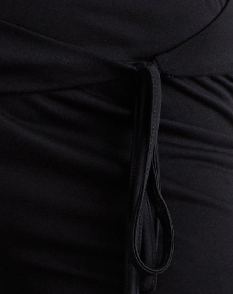 The Donata trousers in a black eco cupro stretch jersey fabric, feature a wide leg style with a fold-over waistband. The design includes a belt-like detail with a tie on the left-hand side for an adjustable finish. Style with the matching Prilla top.