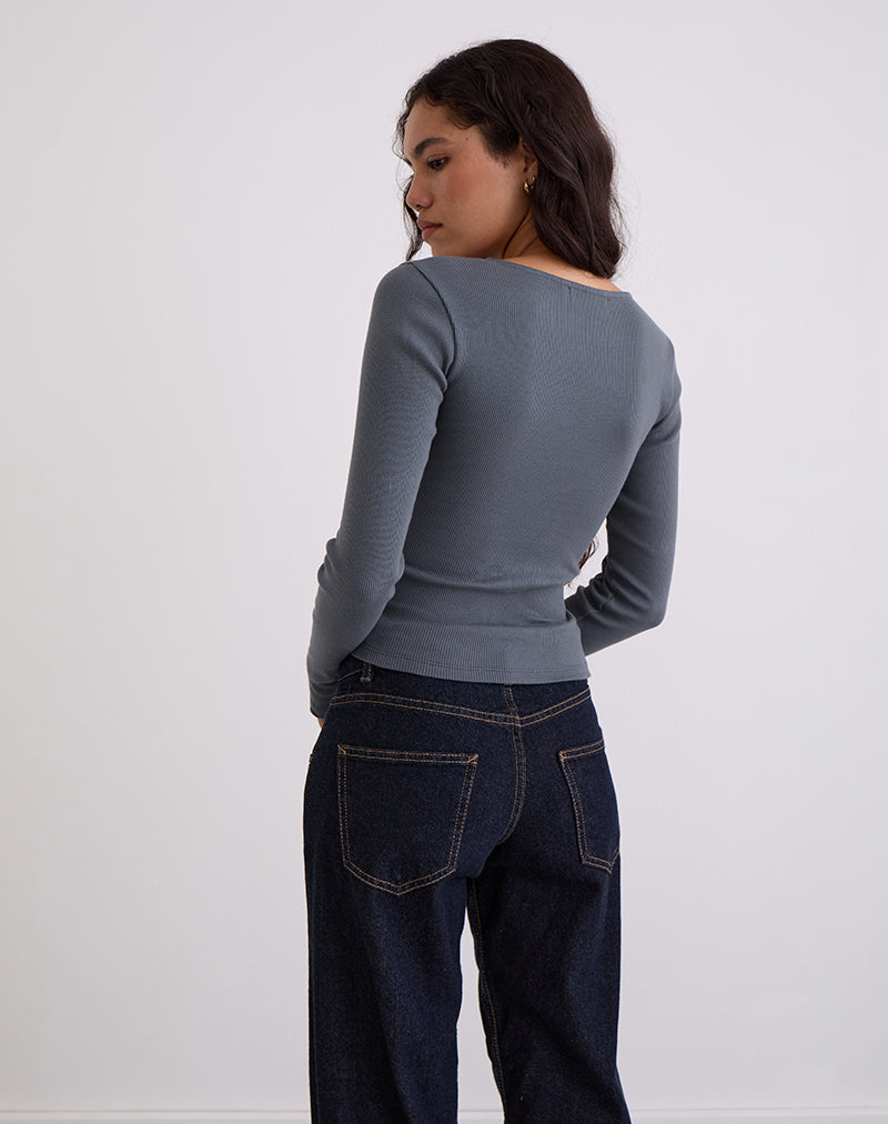 Dulcet Ribbed Plunge Long Sleeve Top in Blue Granite