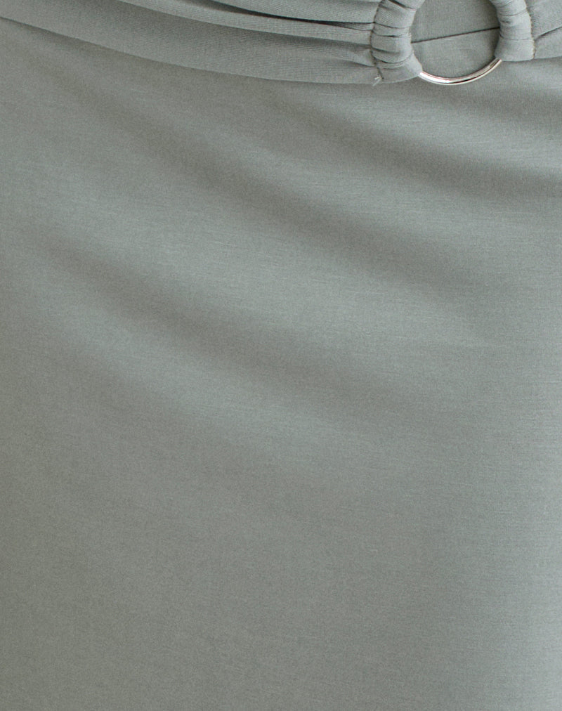 The Esmeray skirt in a london fog fabric. Boasting a midi length, with asymmetric hemline. Complete with a flowy belt-like fabric around the waist, with ring detailing. For a cute co-ord style with the matching Nina top.