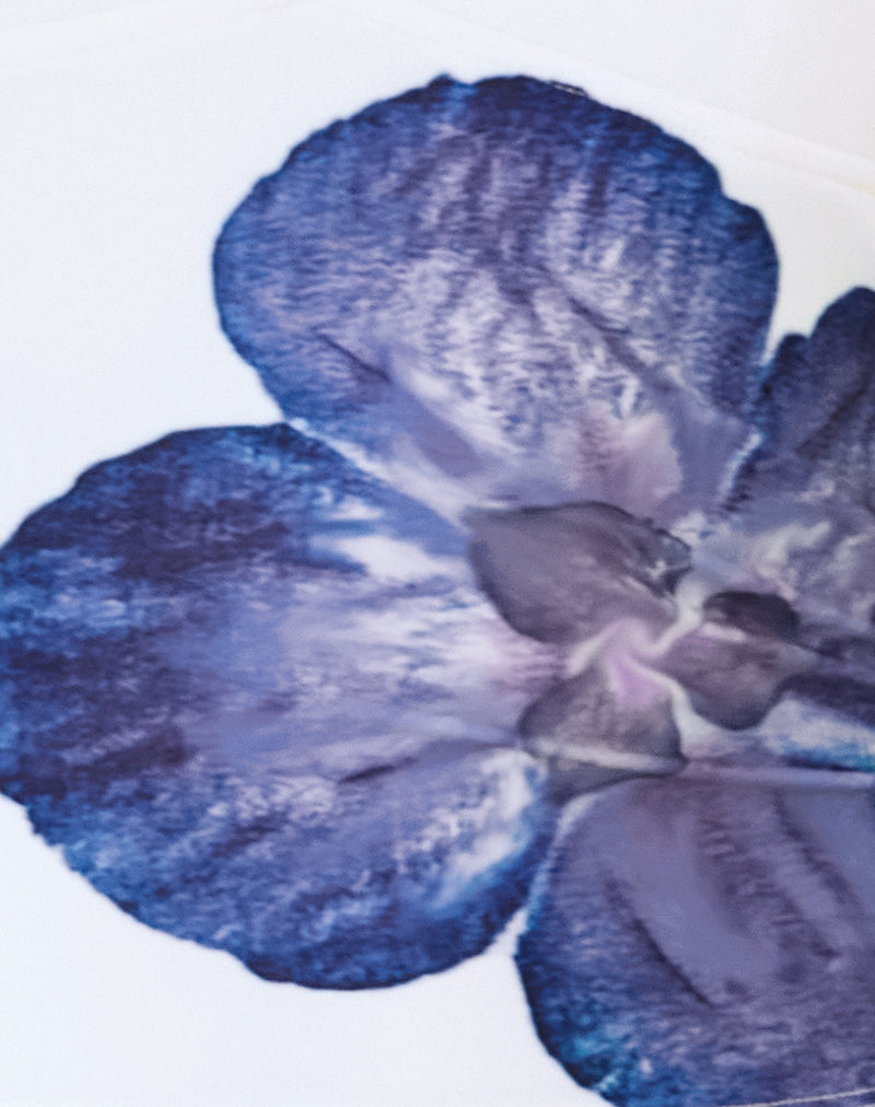 Low rise bikini bottoms with high leg shaping with a placement blue orchid print on an ivory recycled swim spandex. Complete the look with the matching Cerry top.