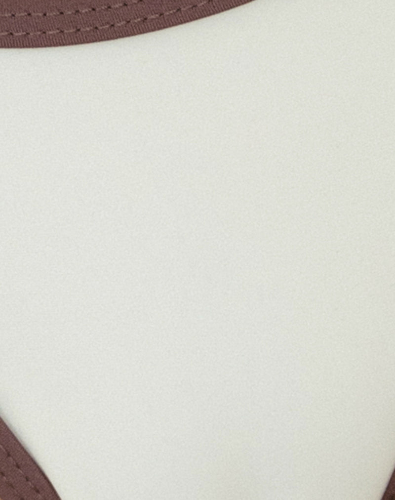 The Farida are a low rise bikini bottom with a high leg shaping in an ivory colourway, finished with brown contrast binding, cut from a recycled swim spandex. Complete the look with the matching Cerry top.