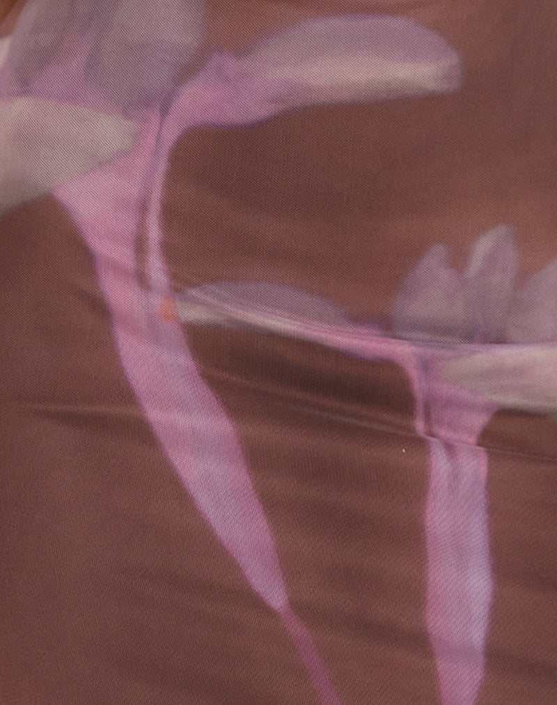 The Fayola maxi dress in brown printed mesh fabric with blurred floral print CF. A maxi dress featuring a crew neck, sleeveless design and solid lining.