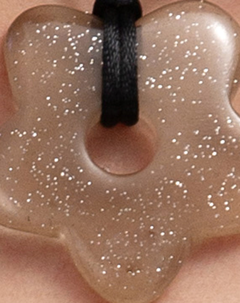 The Flower necklace, a black string necklace with a brown resin flower pendant.