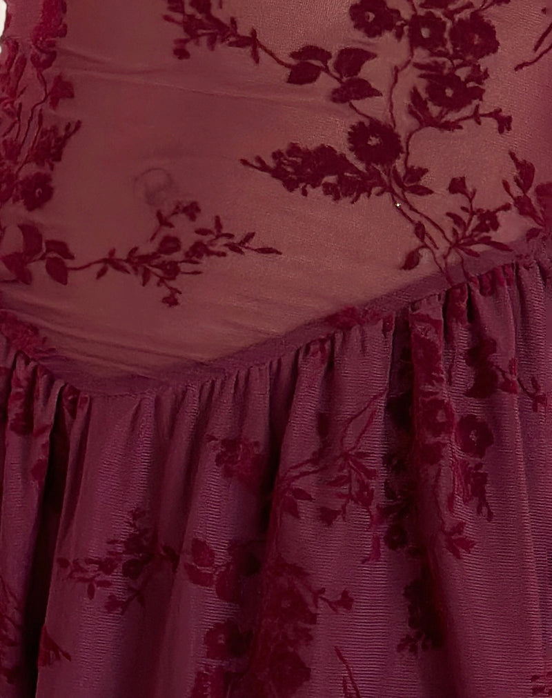 The Geni mini dress features floaty cap sleeves, a deep V-neck adorned with picot trim with a satin bow, and an unlined waist panel in a botanical flower maroon print.