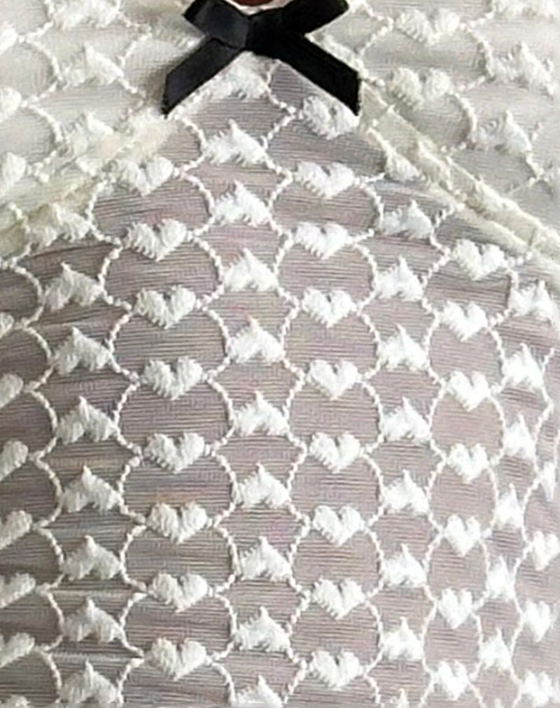 Grafika, a cami top with thin straps and sweetheart neckline. Detailed with lined cups and black bow on the chest in a cute all over heart lace in ivory. Pair with our matching Camigo skirt.