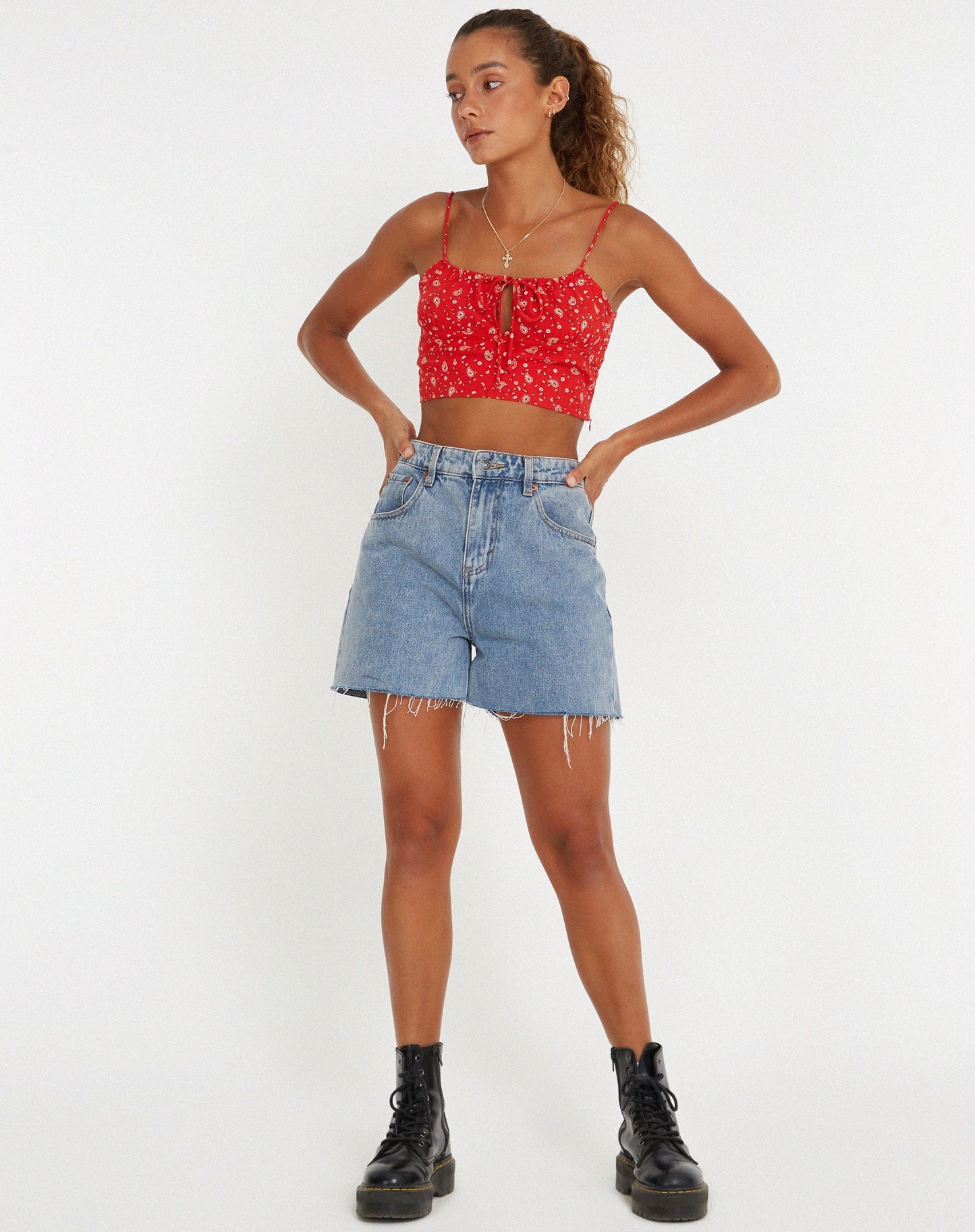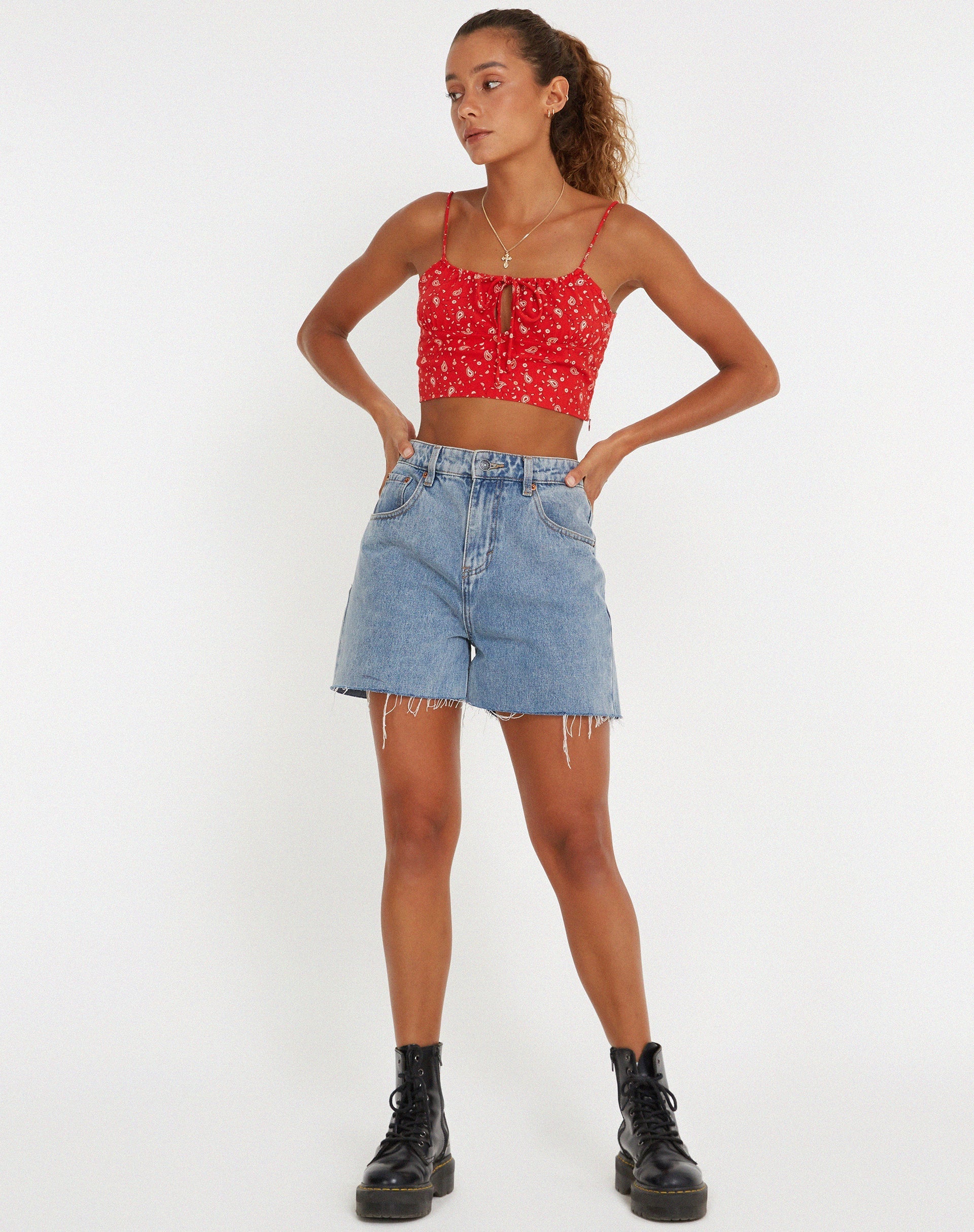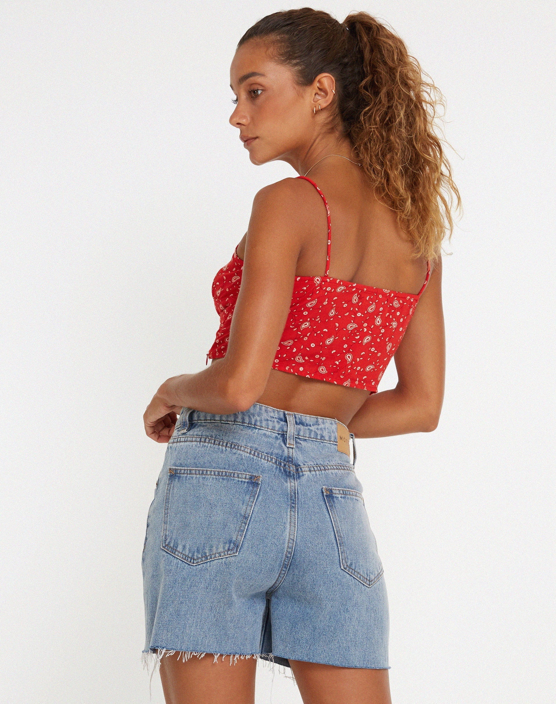 This Hema top will have you summer ready. Featuring a cropped fit with thin straps and tie up detailing in a paisley fun red print. Style with some denim shorts.