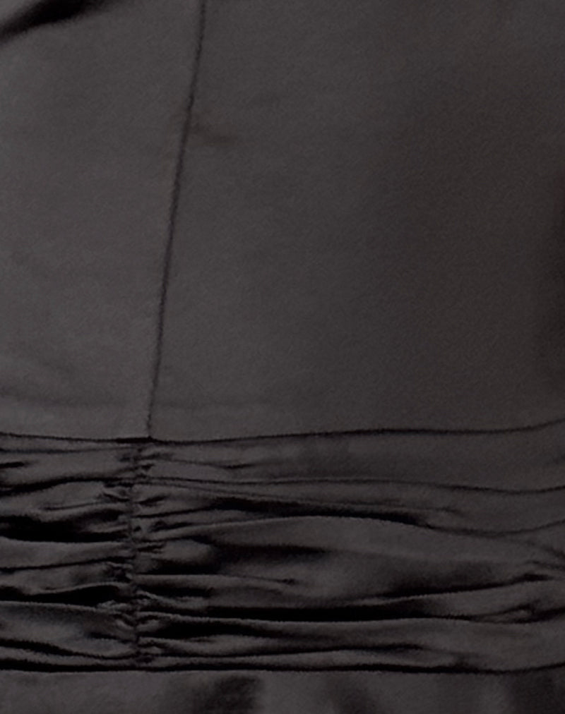 The Hydri dress in a black satin fabric, features a thick halterneck strap and ruching across the waist, a loose skirt with waterfall hem and tentacle detailing, in a mini length.