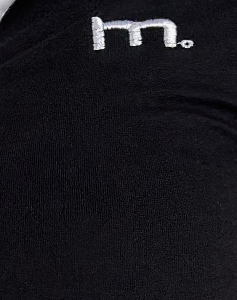 Isda top in black with a white binding on the shoulders and M embroidery detail,. A regular fit tee with polo style neckline and short sleeve fit.
