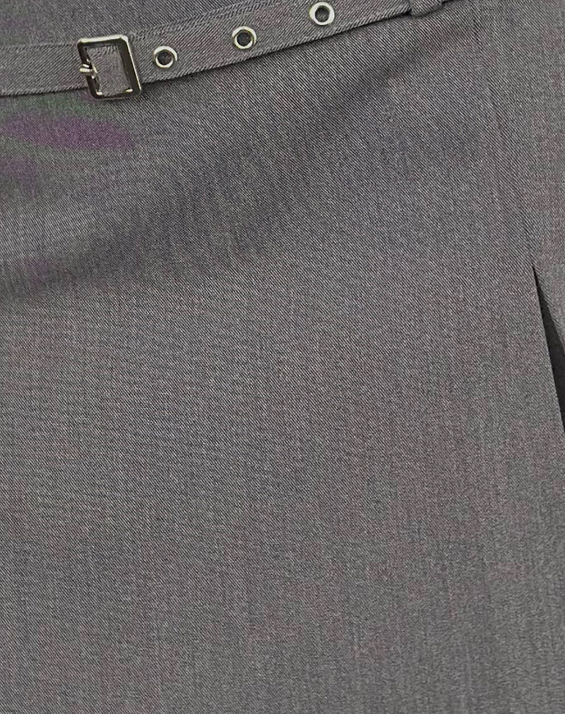 In a tailored charcoal fabric, the Isti skirt features a low rise, mini design with pleated detailing at the front. It boasts a functional belt with silver hardware and a concealed zip fastening. We have styled with our Giovanna cardigan.