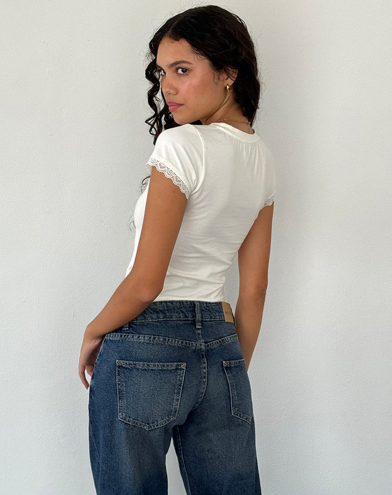 Izzy top in off white lycra. Slim fit regular length with a short sleeves with lace trim. Featuring a vintage deer print.