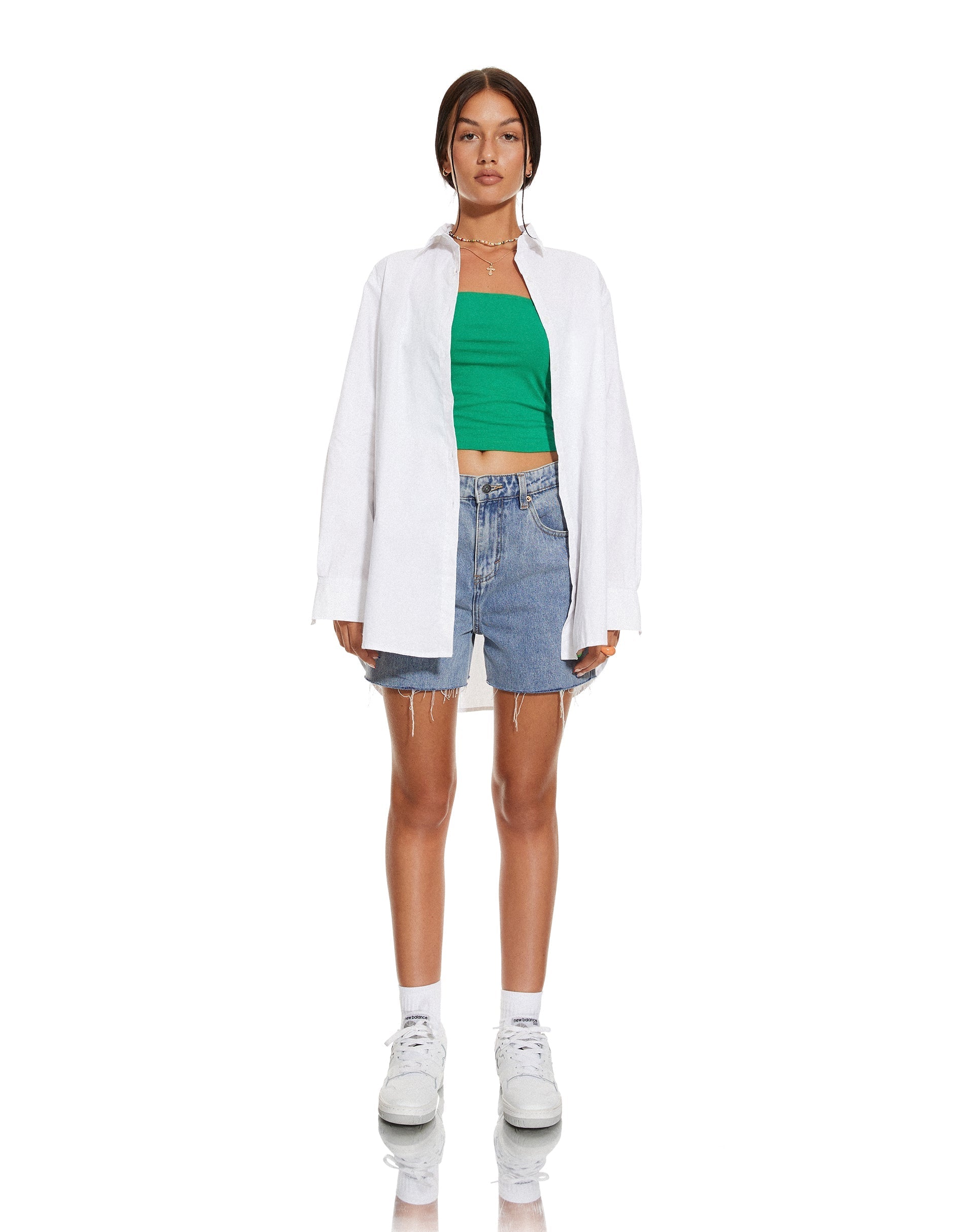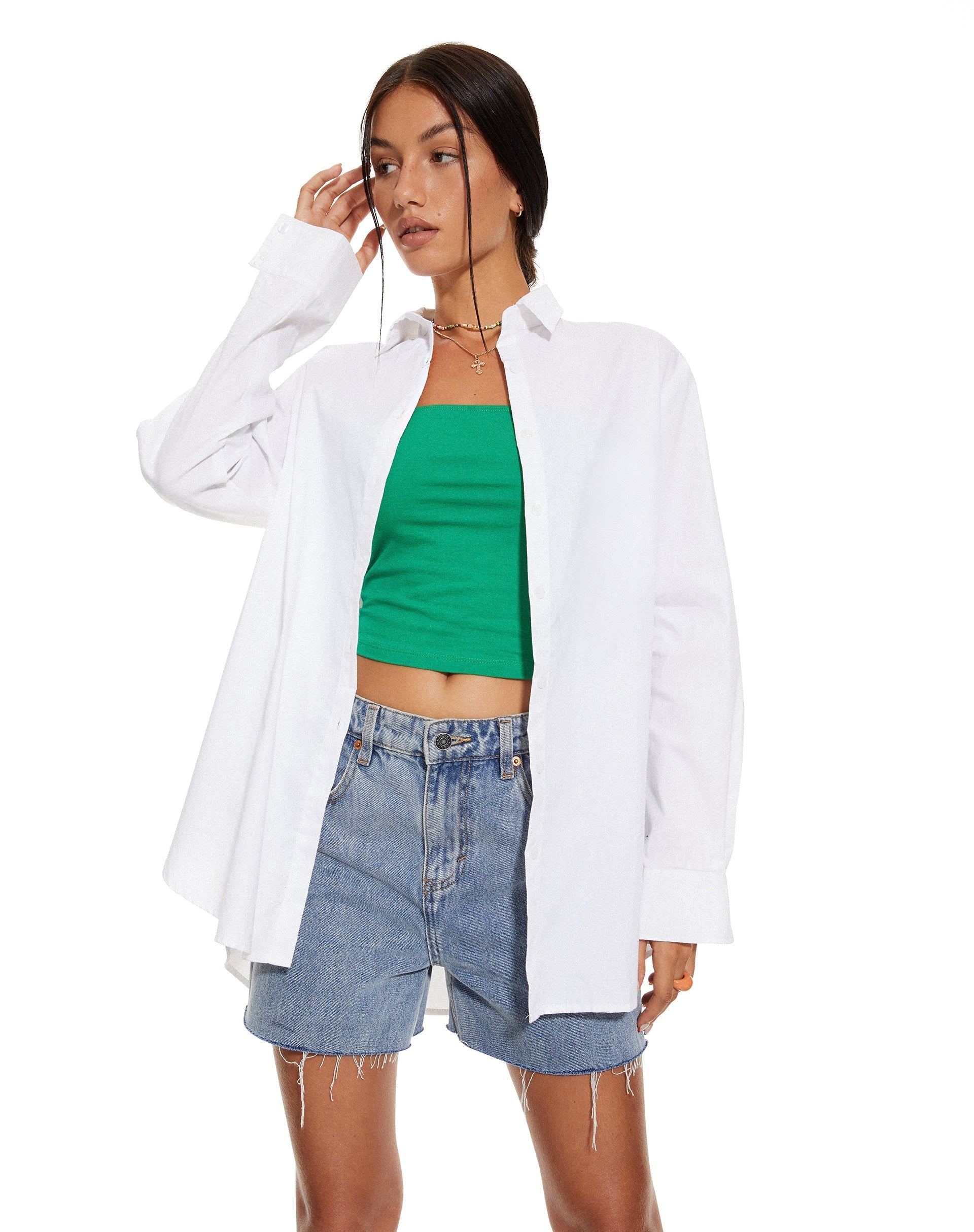 Our Janes shirt is the perfect layering piece. In white, it features an oversized fit, oversized cuffs and a button down design. Style over the Shae bandeau with some denim shorts.