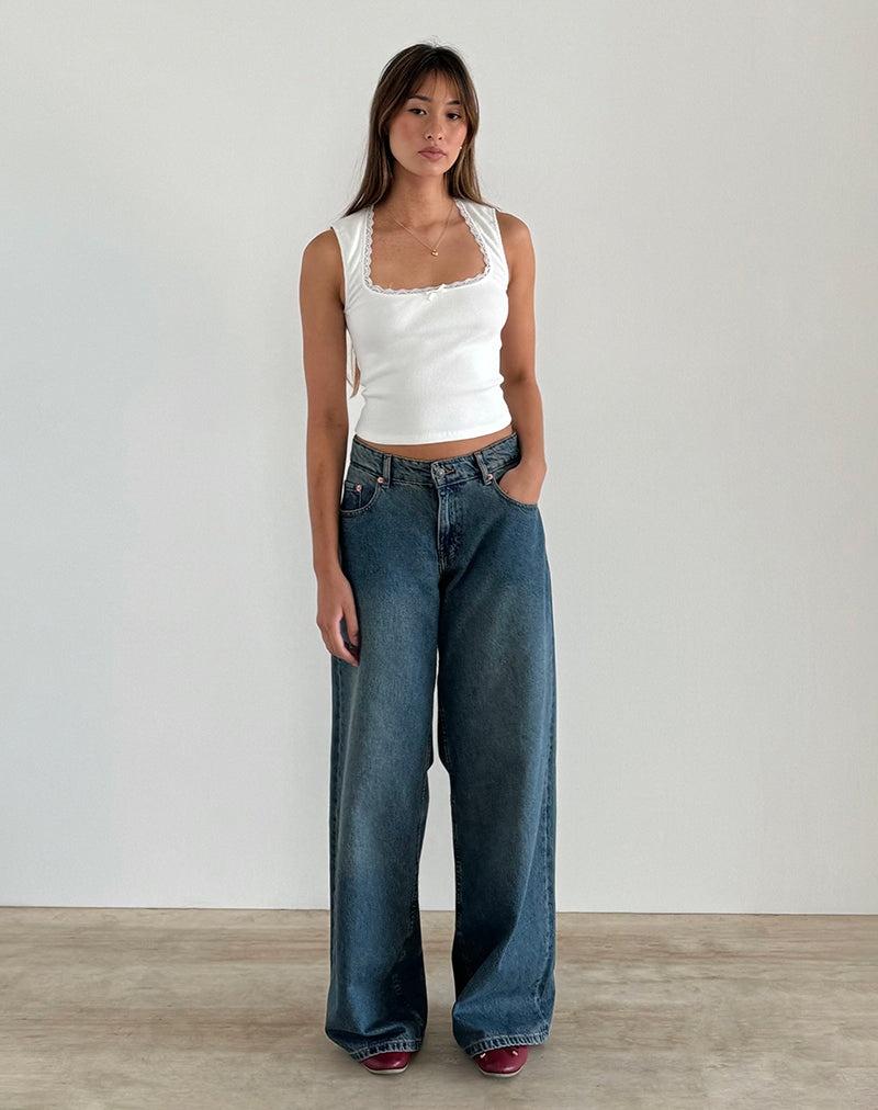 In a off white jersey rib fabric, the Jinila top features a longline, bodycon fit with thick straps and a square neckline with a lace trim and bow detail. Pair with our Roomy jeans to complete the look.