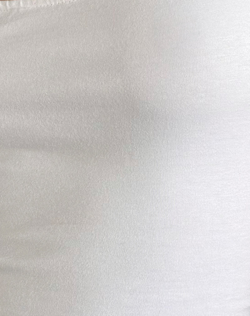 Sleeveless white crop top in a lycra material featuring thick straps with red bow embellishments and square neckline.