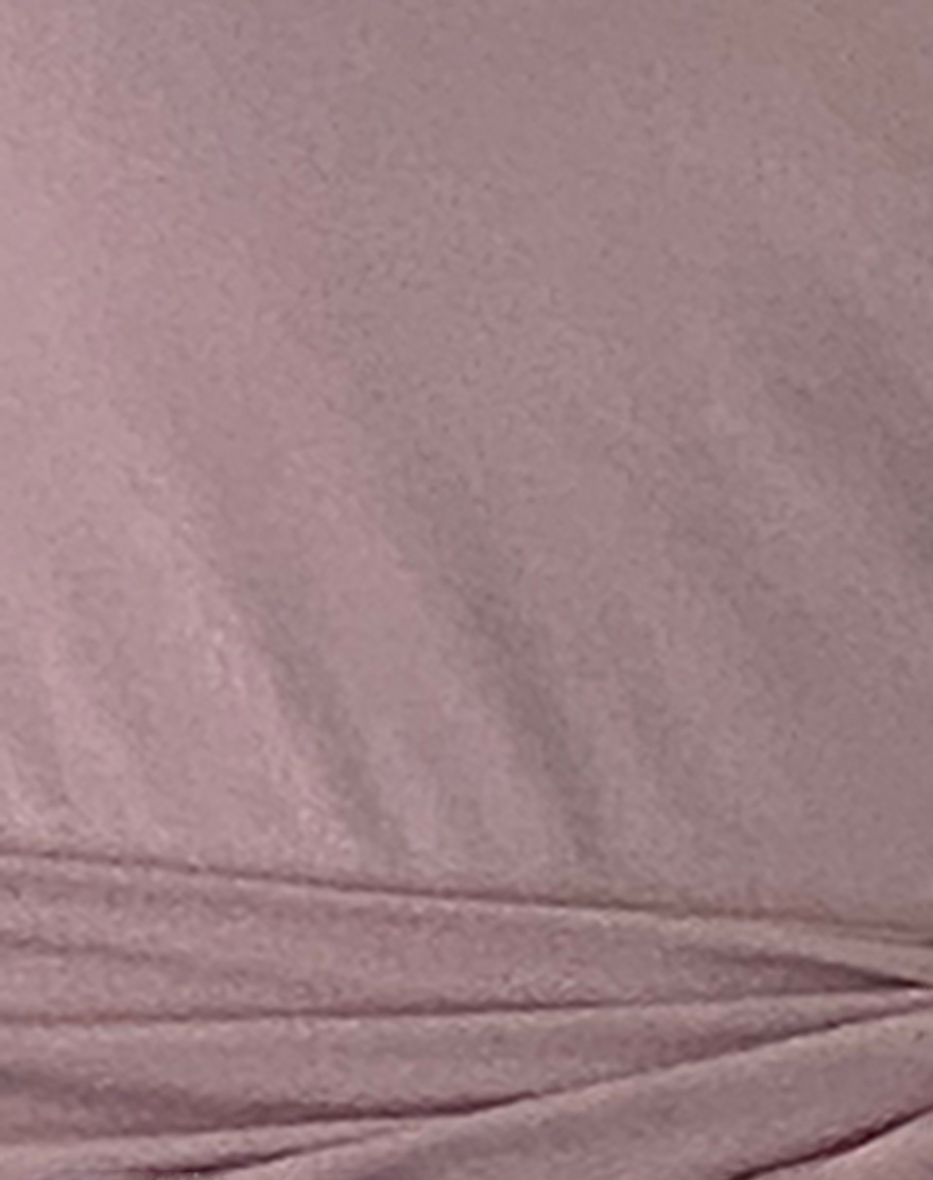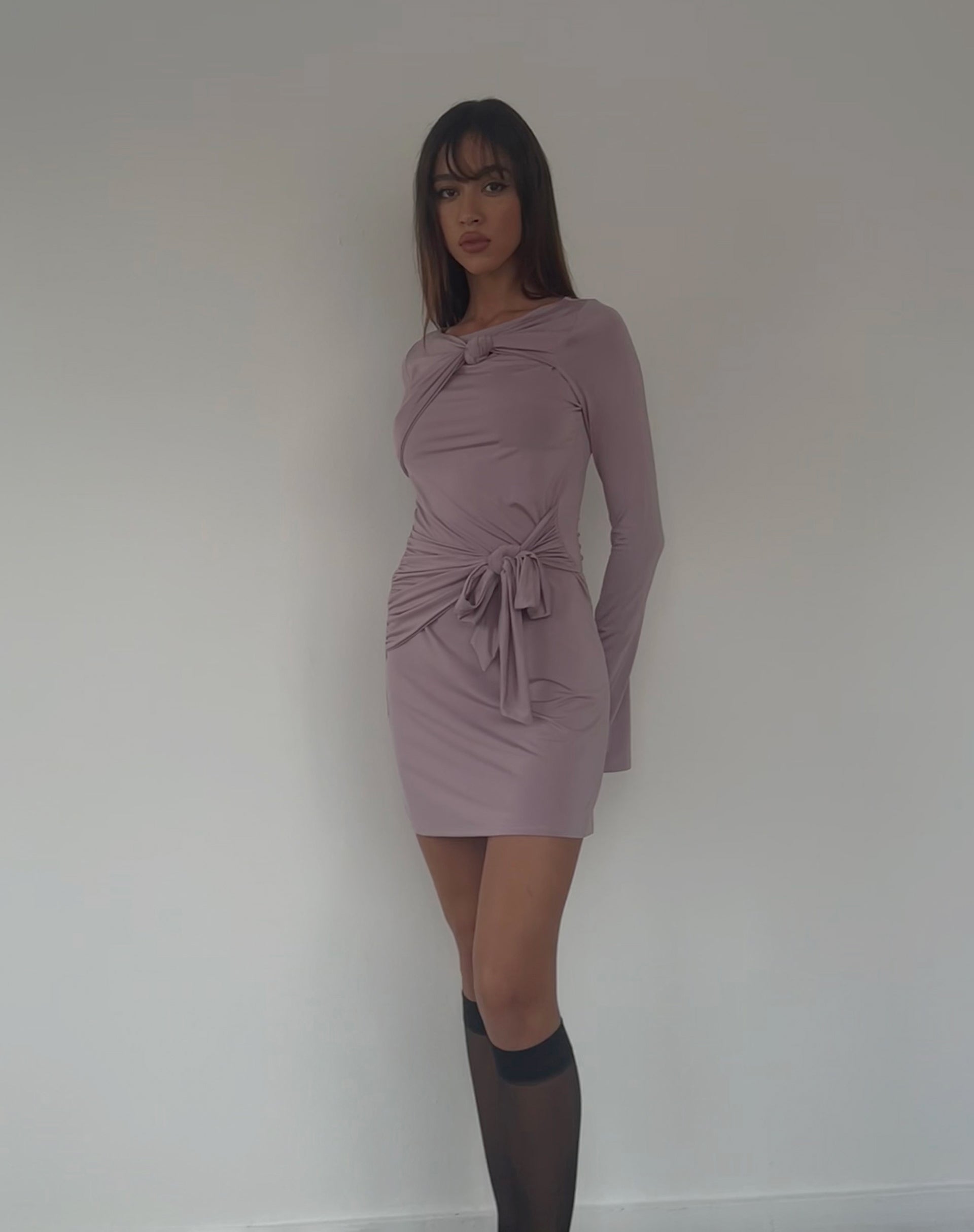 Long poet sleeve mini dress, with decorative knots in a slinky mauve material.