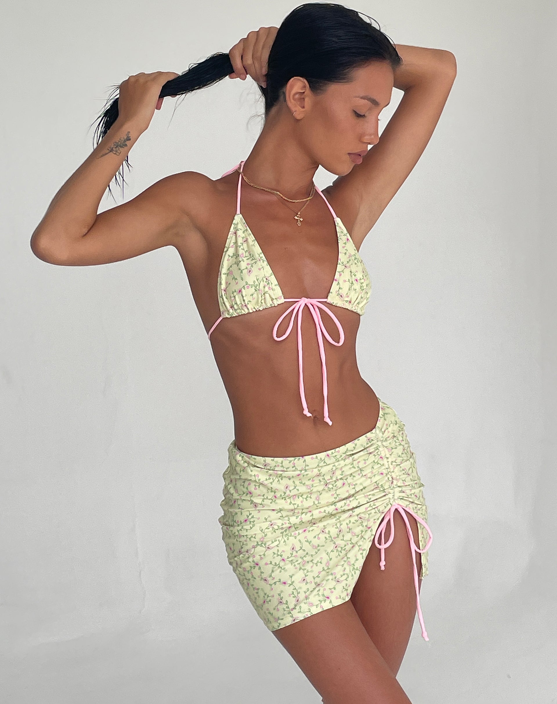 Complete your beach 'fit with the Kelsi Skirt. Featuring a mini length, a side split with ruching and pink ties, in a paisley yellow print. Pair with our matching Pamita bikini top