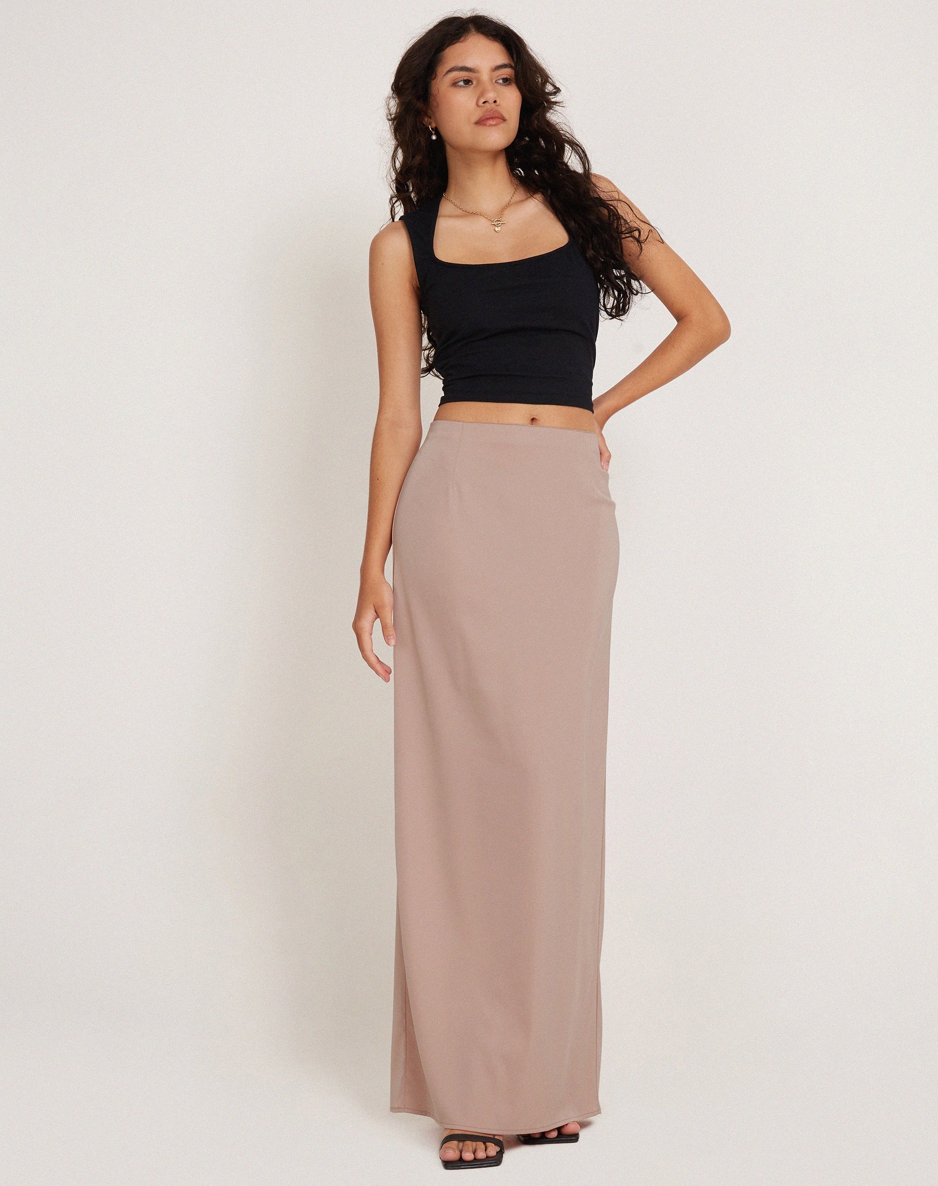 Our layla skirt now in dusty pink, featuring a maxi length in satin material. Pair with our jinsu crop top in lycra black for the perfect outfit inspo.