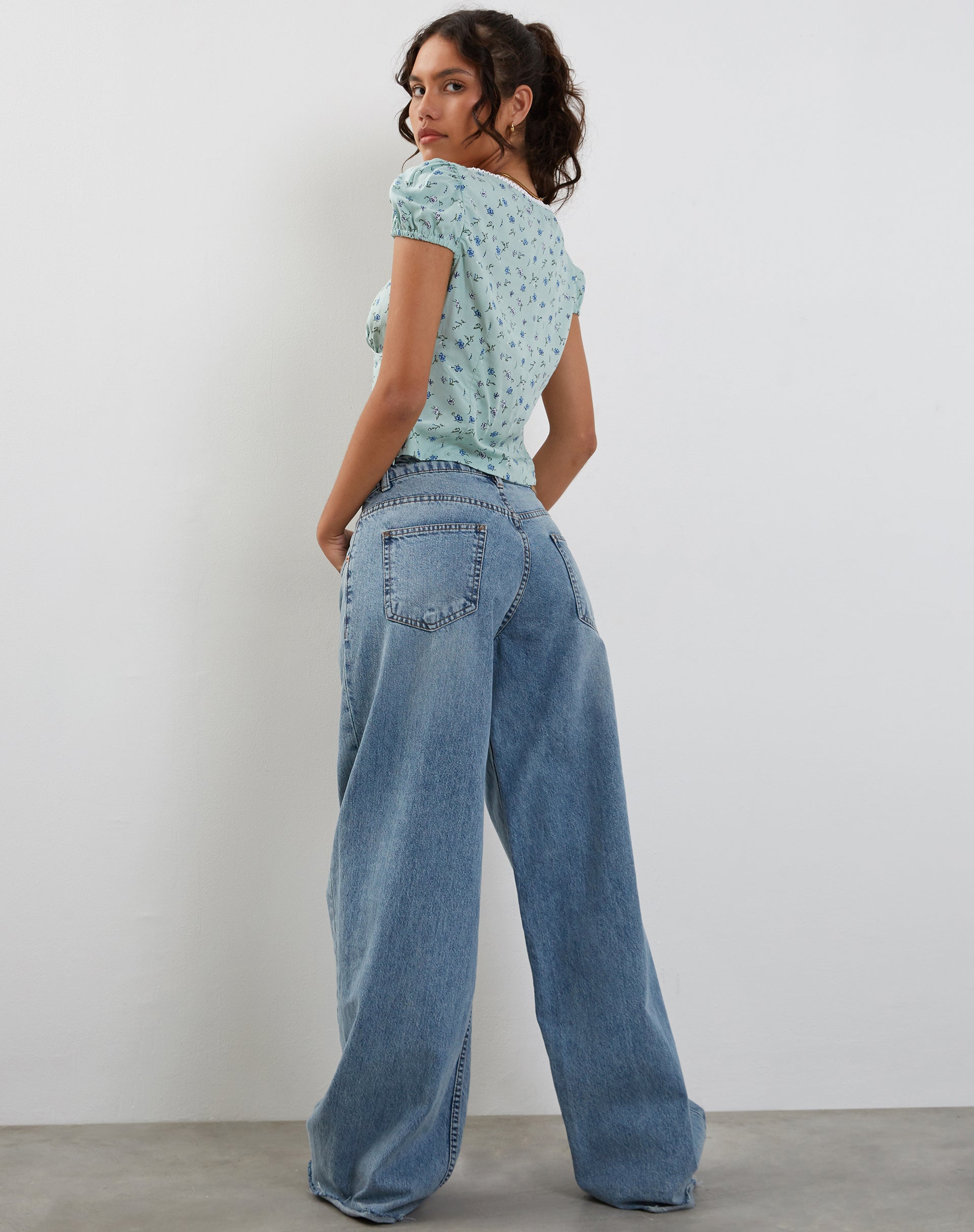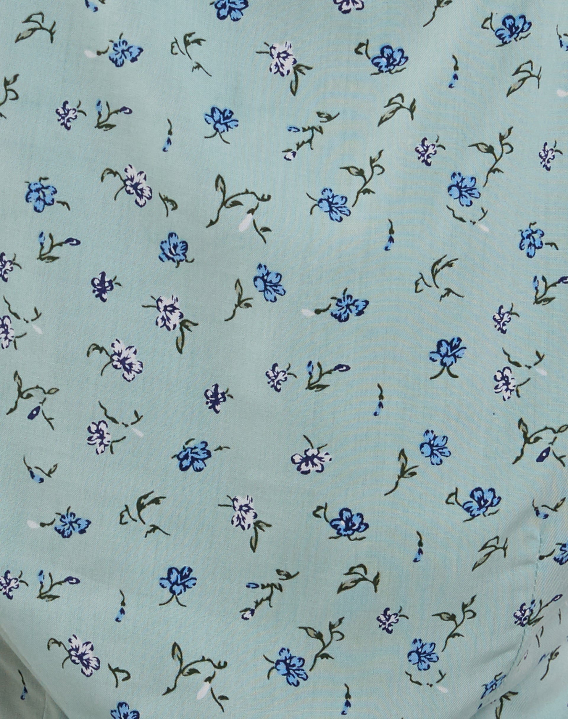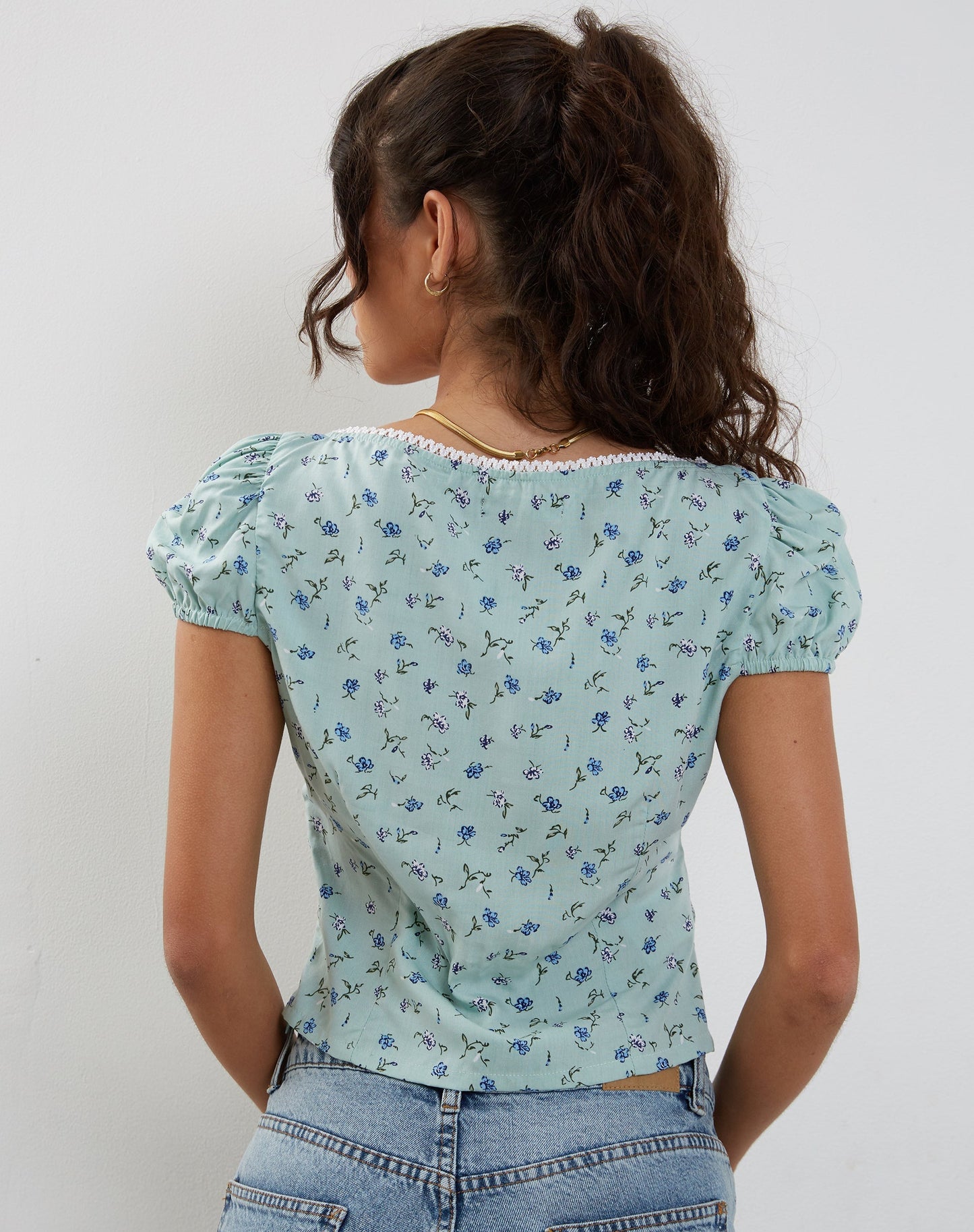 Add some print to your wardrobe. The Laz top features a regular hem with capped, puff sleeves and a scoop neckline with lace trim detailing in a green woven fabric. Complete with a repeat pretty petal print. Paired with our Roomy Raw Hem in vintage blue wash.