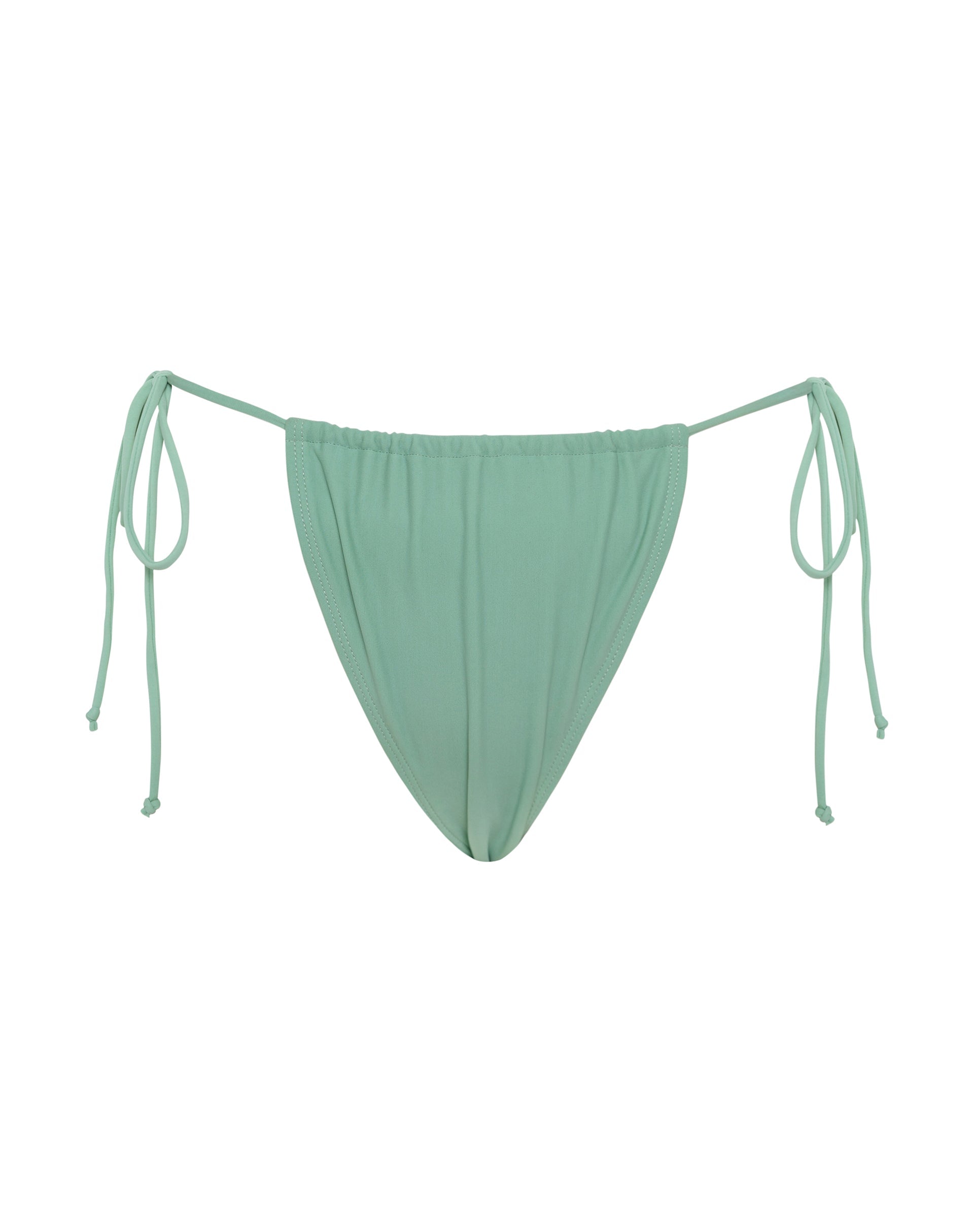 Achieve the perfect beach look with our Leyna bikini bottom in lichen green. Featuring a micro, high rise silhouette and tie side straps with ruched detailing for an adjustable fit. Paired our Ricoa bikini top for the best fit.