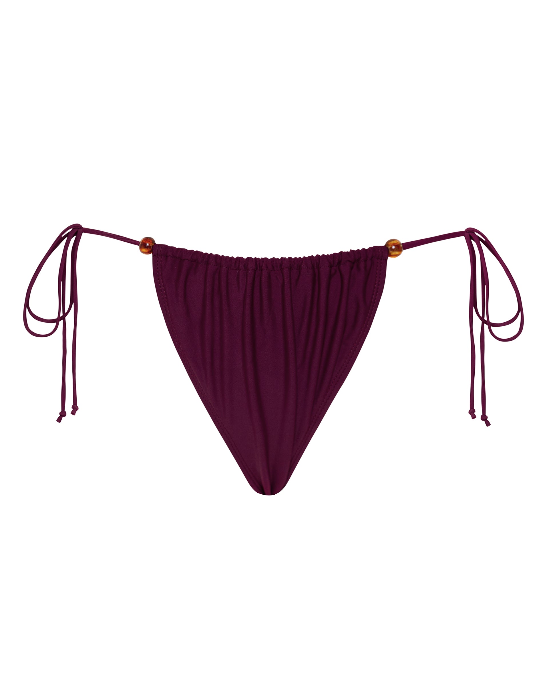 The Leyna bikini bottom features adjustable ties and ruching at the front and back, in a deep burgundy colour featuring matching colour beads. Best paired with our Pami Bikini Top.