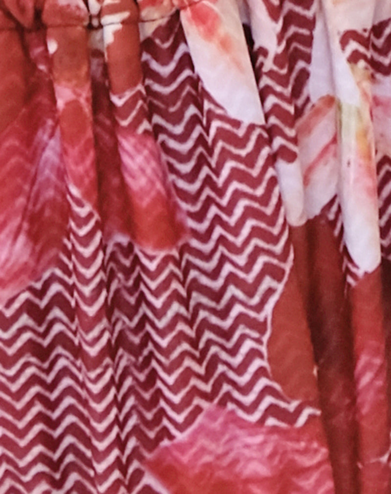 The Leyna low rise bikini bottoms in a burgundy orchid print on a mini zig zag base. Featuring adjustable ties at each side and ruching on the front and back for adjustable coverage. Finished with orange tortoise shell beads at the end of all and cut from recycled swim spandex. Complete the look with matching Pami bikini top.
