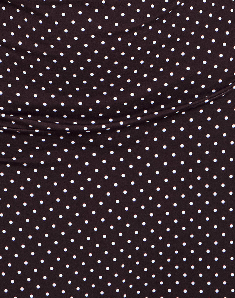 The Luscian dress features a plunge neckline, a-line design and mini cut. Finished in an all over brown jersey fabric with repeated white micro polka dots.