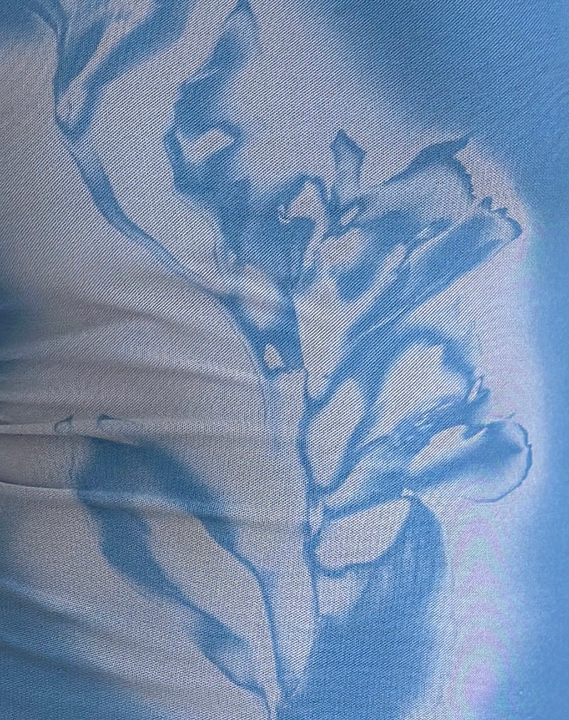 Long sleeve bardot top finished with flared sleeves and a full length body in a blue mesh with a placement floral lumen print on the front body. Complete the look with our Nidya mini skirt.