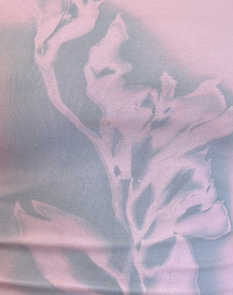Long sleeve bardot top finished with flared sleeves and a full length body in a peach mesh with a placement floral lumen print on the front body.