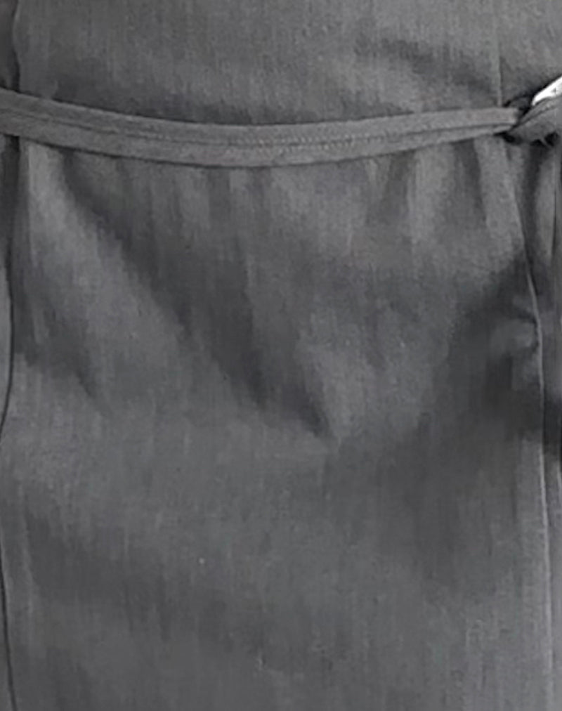 The Magaska mini Dress in charcoal soft tailoring is a bandeau dress featuring an a-line skirt with a drop low waistband. It includes a waist belt strap in self fabric with a silver buckle clasp for added detail. The dress also has a concealed zip entry at the centre back.