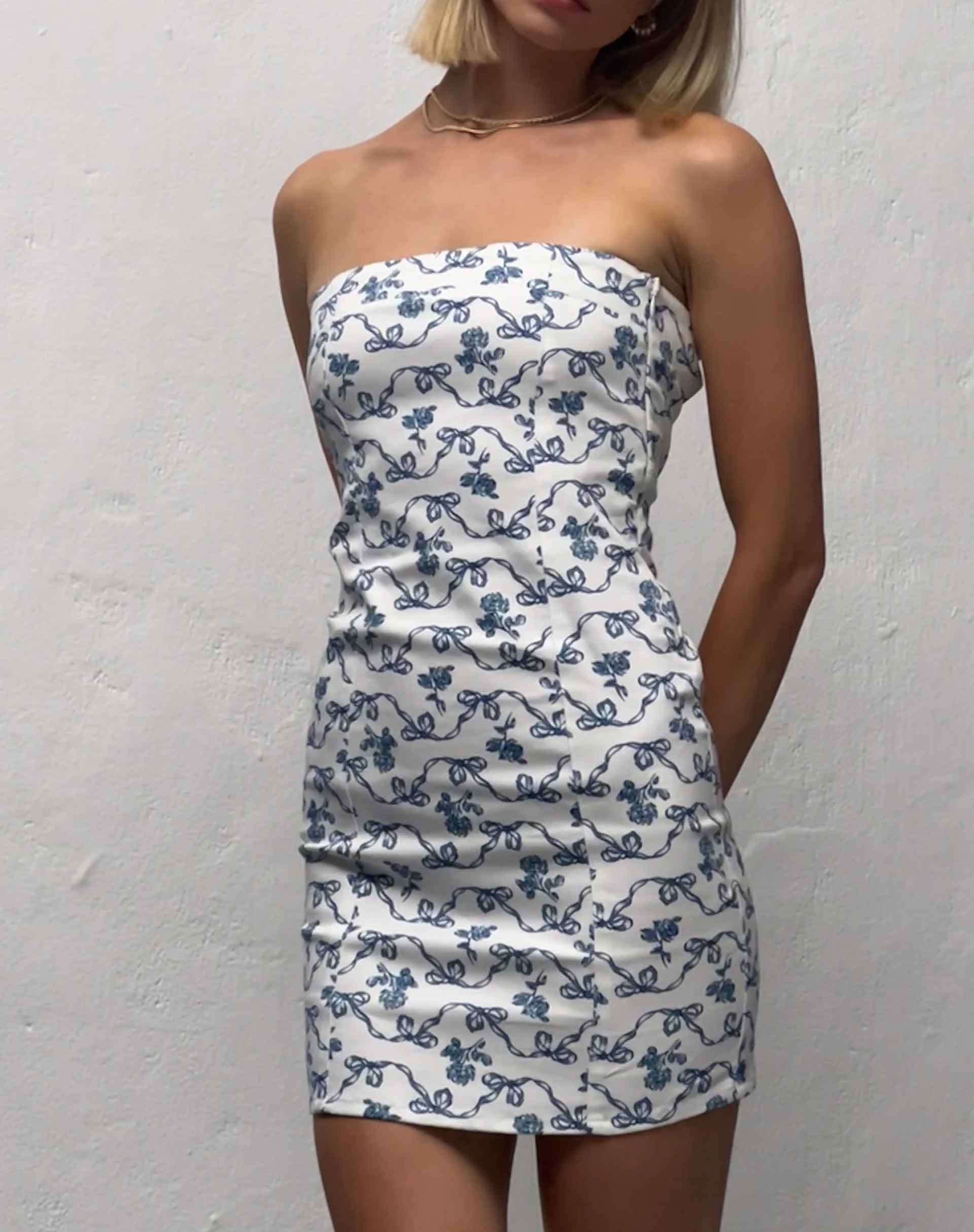 Stand out with our new Majken dress, featuring a blue and white ribbon print in a mini length with a blue ribbon tie back and bandeau neckline.