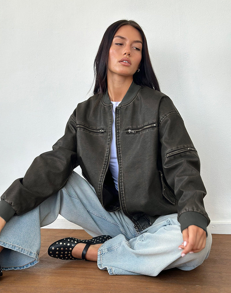 Marco Distressed Bomber Jacket in PU Charcoal