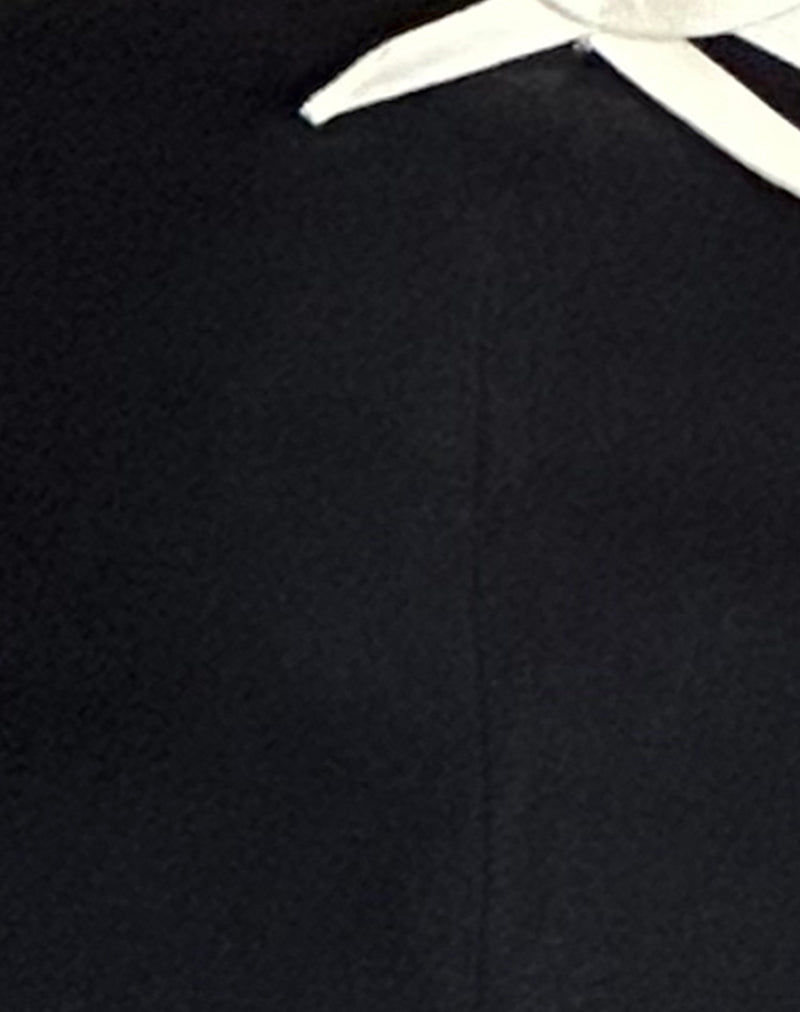 Matuha top features a bandeau sleeveless design with tight fit in black with white binding along neckline complete with small ivory bow detail on left.