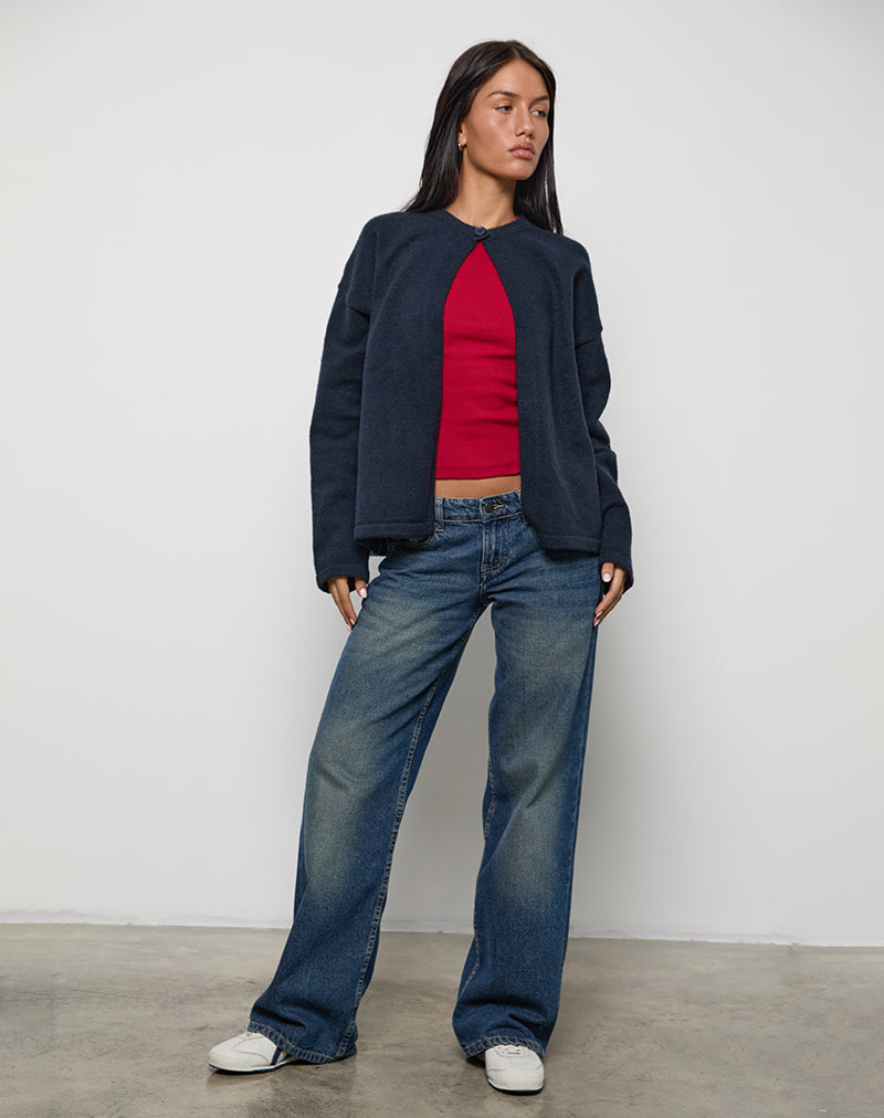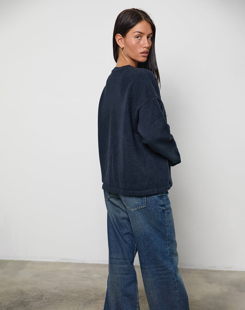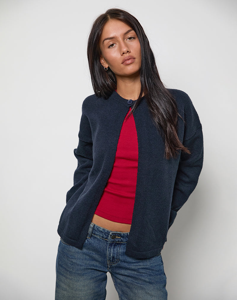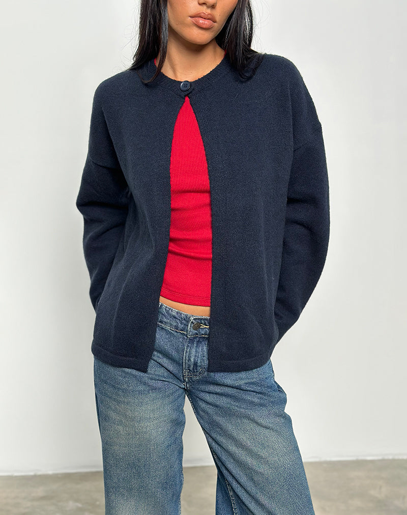 In a navy blue flat knit fabric, the Maureen cardigan features long sleeves, a crew neckline, loose fit and a singular button fastening. Perfect with our Parallel jeans.