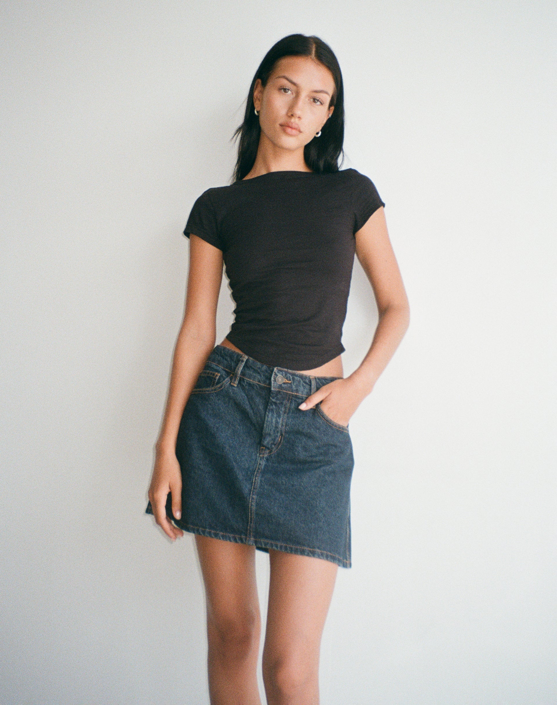 The Mini Skirt you need. It comes in an a-line fit and features front pocket, belt loops, button and zip fastening detail in a denim indigo. Size down for a tighter fit. We love to style with our Jojes top.