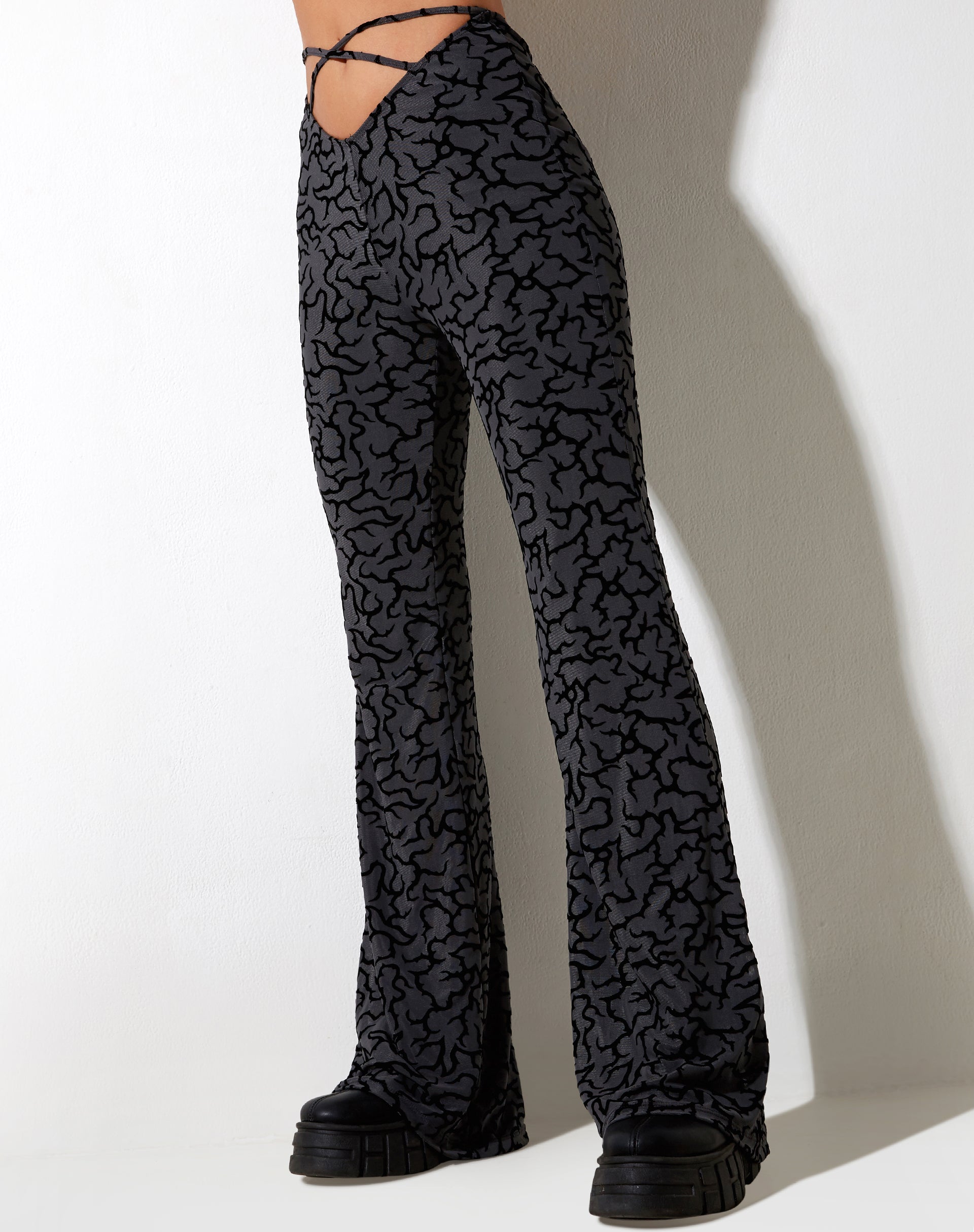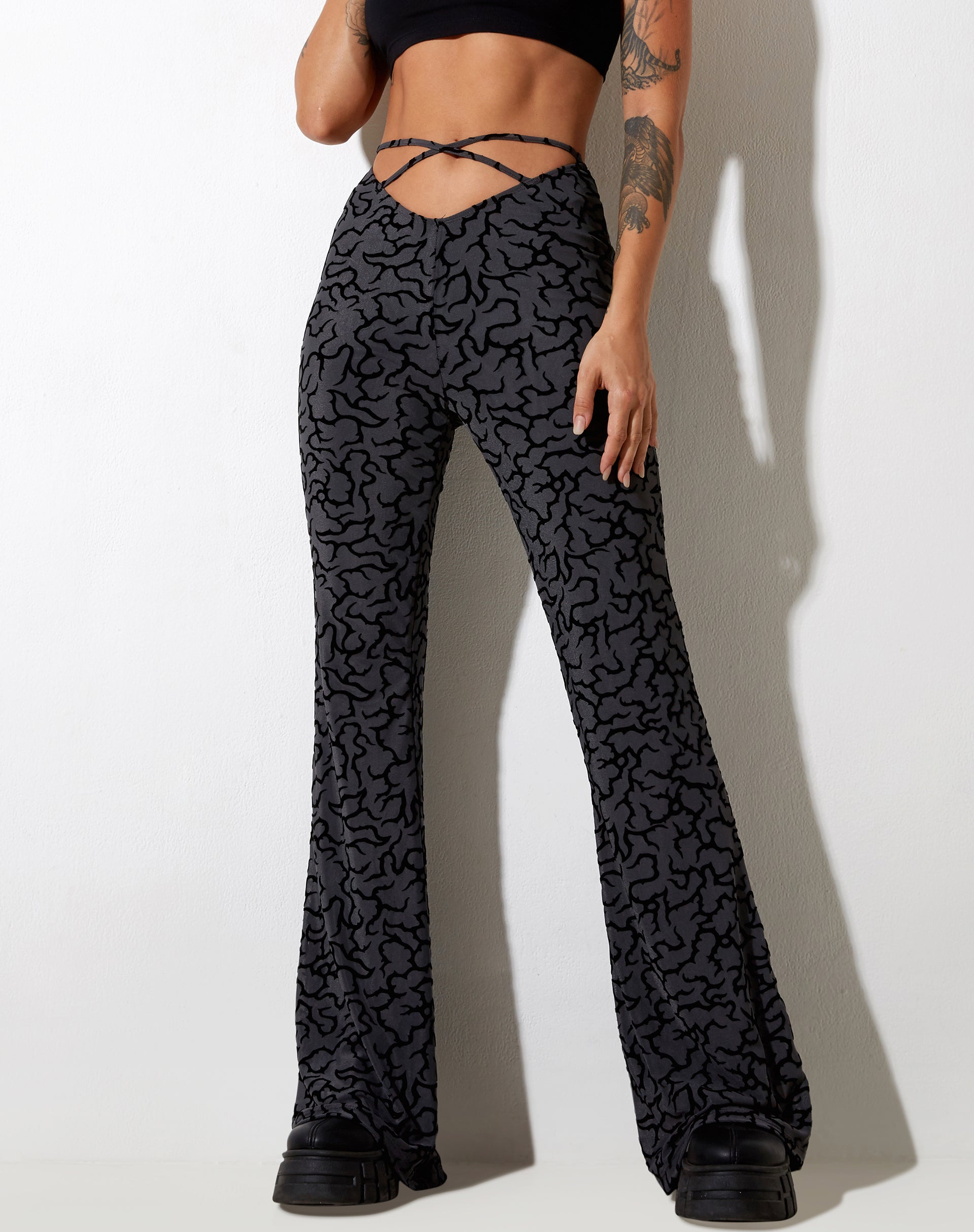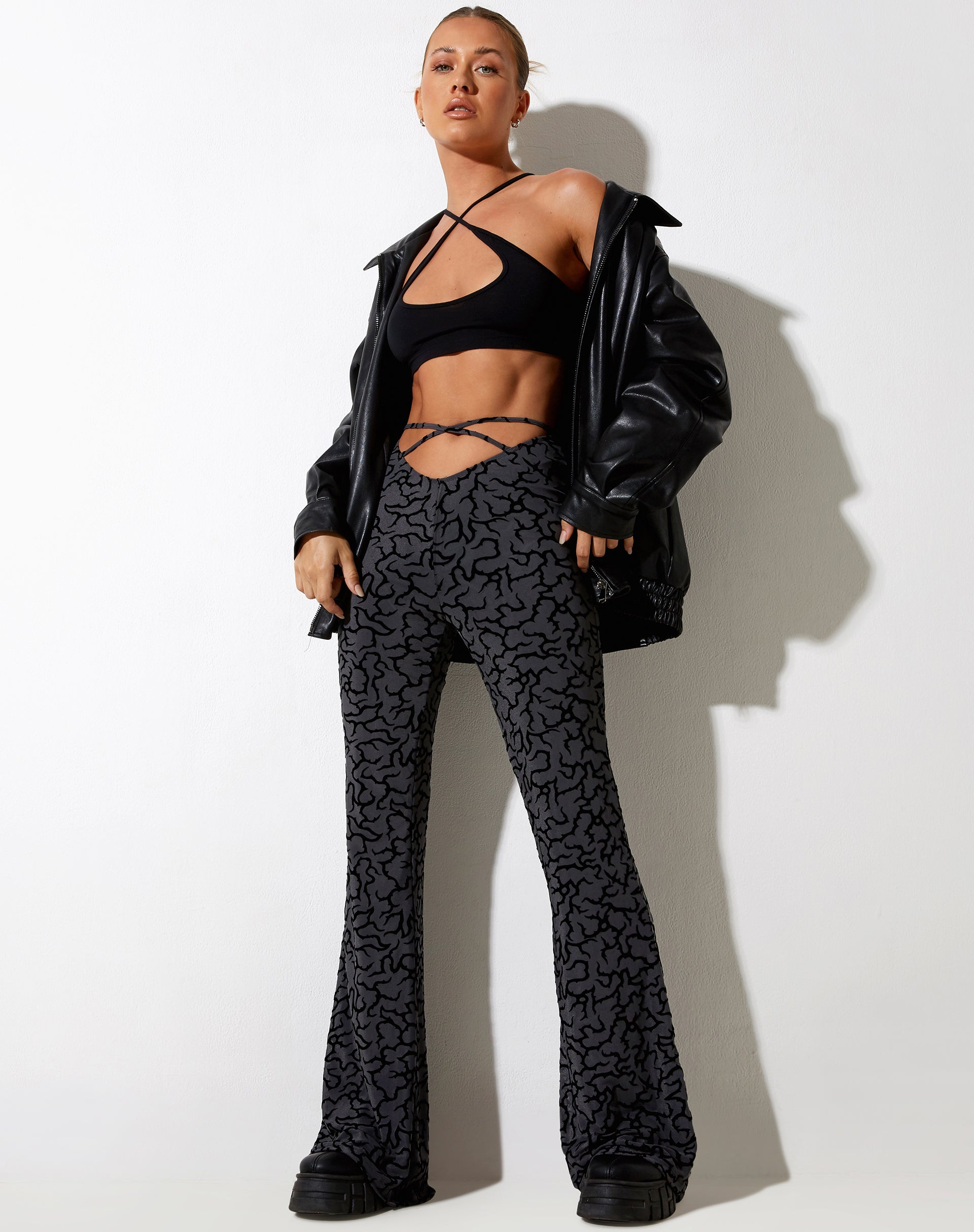 A statement trouser will instantly dress up your look. In a grey and black tibal flock, the Nancha trouser feature a high waist with cutout detailing and flare leg. Double up the print with the matching Ribus top.