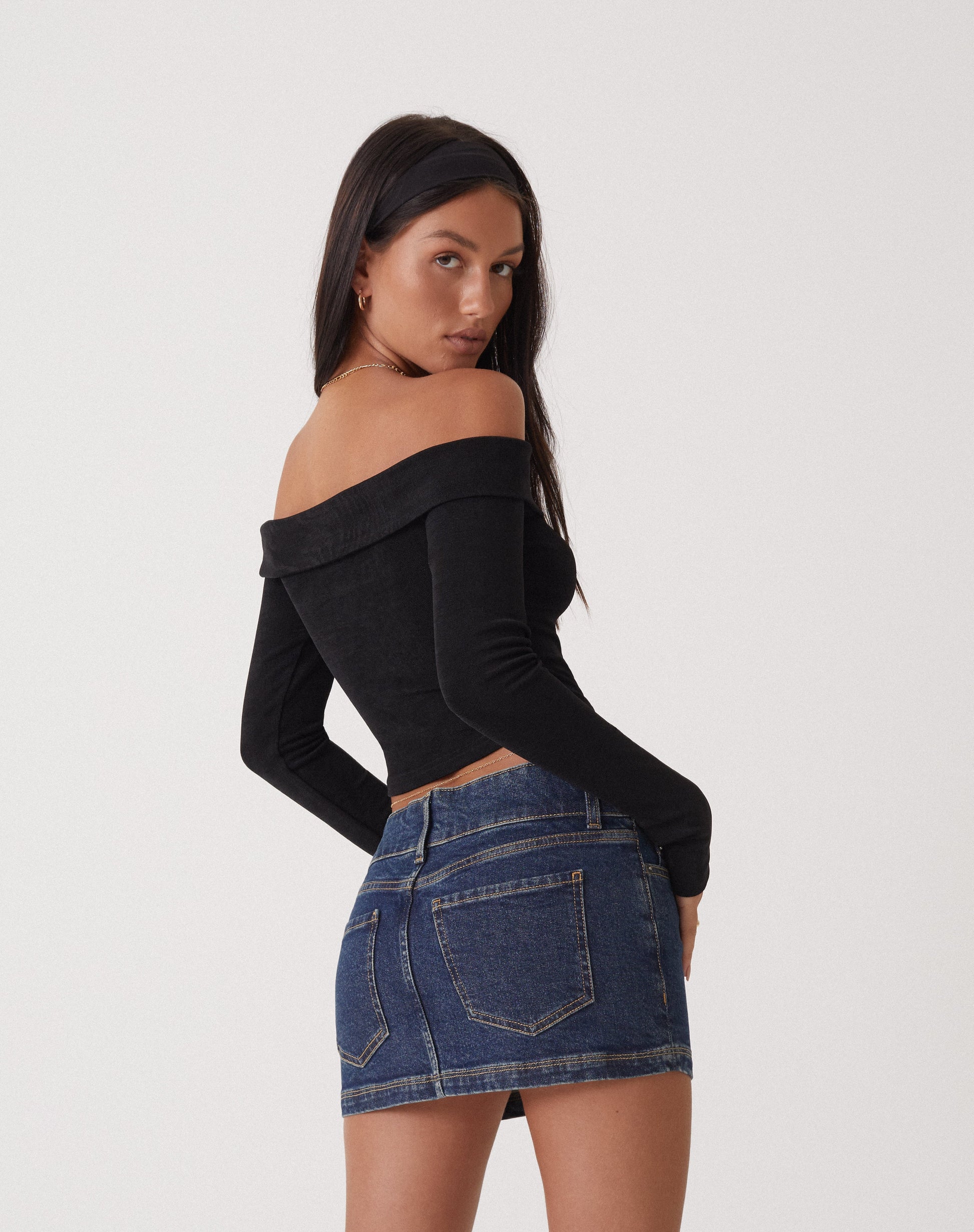 Our Nasari top is a wardrobe staple. In crepe black, it features an off the shoulder fit, long sleeves and a cropped fit. Complete the look with our Low Rise Parallel Jean in Photo Collage Blue and black chunky leather boots.