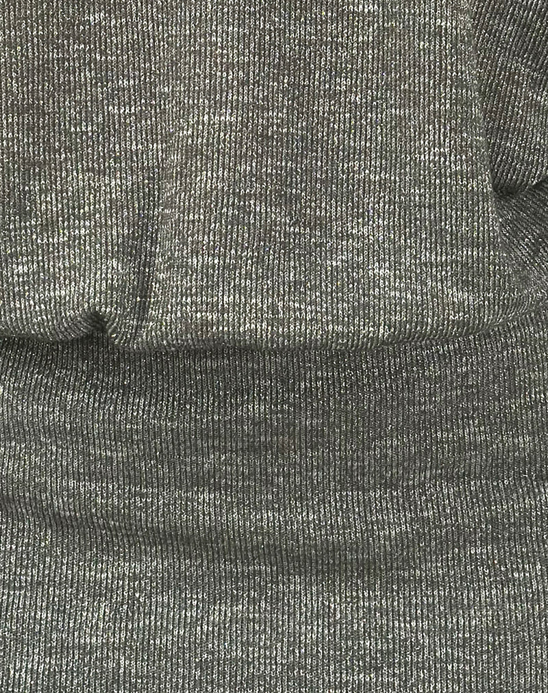 The Reeta dress in khaki shimmer glitter knit features an asymmetrical off-shoulder neckline, half sleeves, and a fitted silhouette. The back showcases an open design with a tie detail at the neck and low-cut panels.