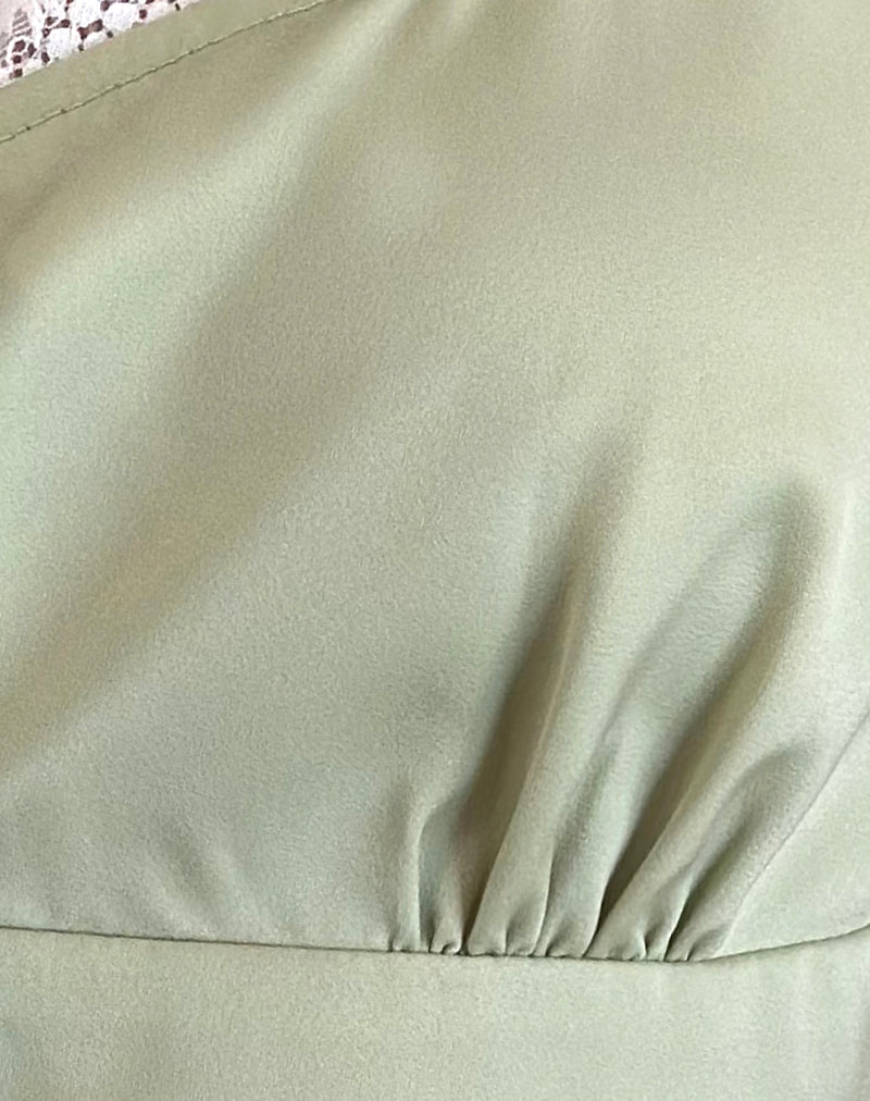 Our Rona butterfly top features an open front with double tie detailing and a lace trim in a soft, sage satin. We love to style with the Picu shorts.