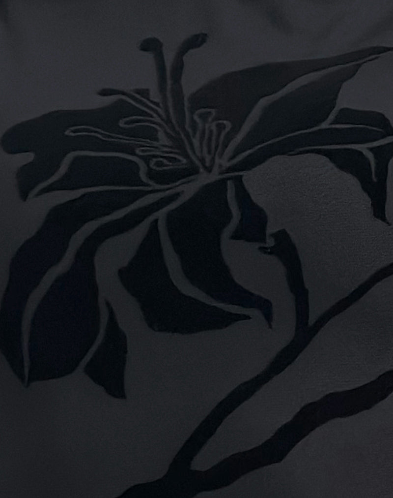 The Salya dress in a black orchids flock mesh fabric, features a regular fit that falls mini length, a crew neckline and sleeveless design with ruffle detailing to one side.