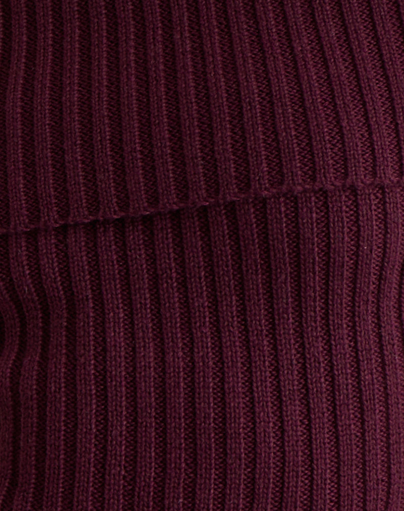 The Saskia top features an off-the-shoulder bardot design with long sleeves and a bodycon fit in a dark cherry red stretchy rib knit fabric. Also featuring an open back with cut-out detail and fixed bow to the centre. Complete the look with Ganta slim trouser in pinstripe black.